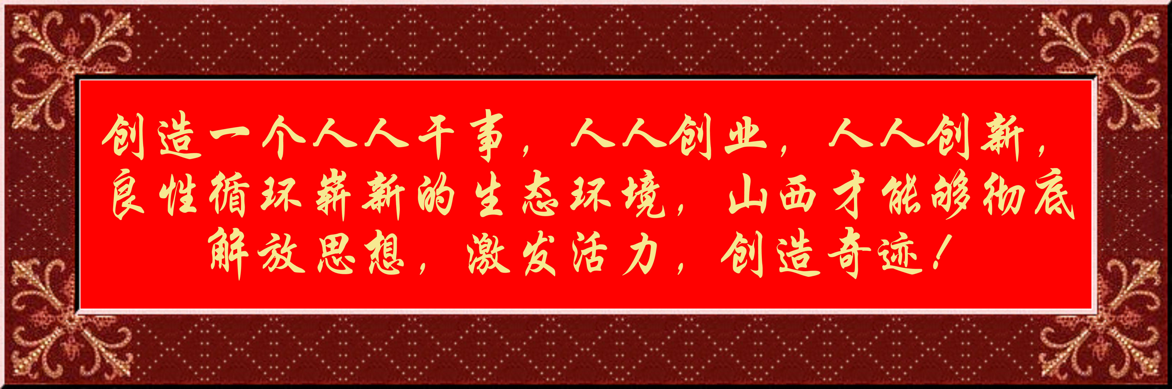 山西需要发展,需要大发展,需要以更大的胆识和魄力面对自身的差距和不足,那就是敢于革自己的命,把那些不适应新时代发展的条条框框彻底打破,把那些只为名不为民的庸官彻底清除,创造一个人人干事,人人创业,人人创新,良性循环崭新的生态环境,山西才能够彻底解放思想,激发活力,创造奇迹!