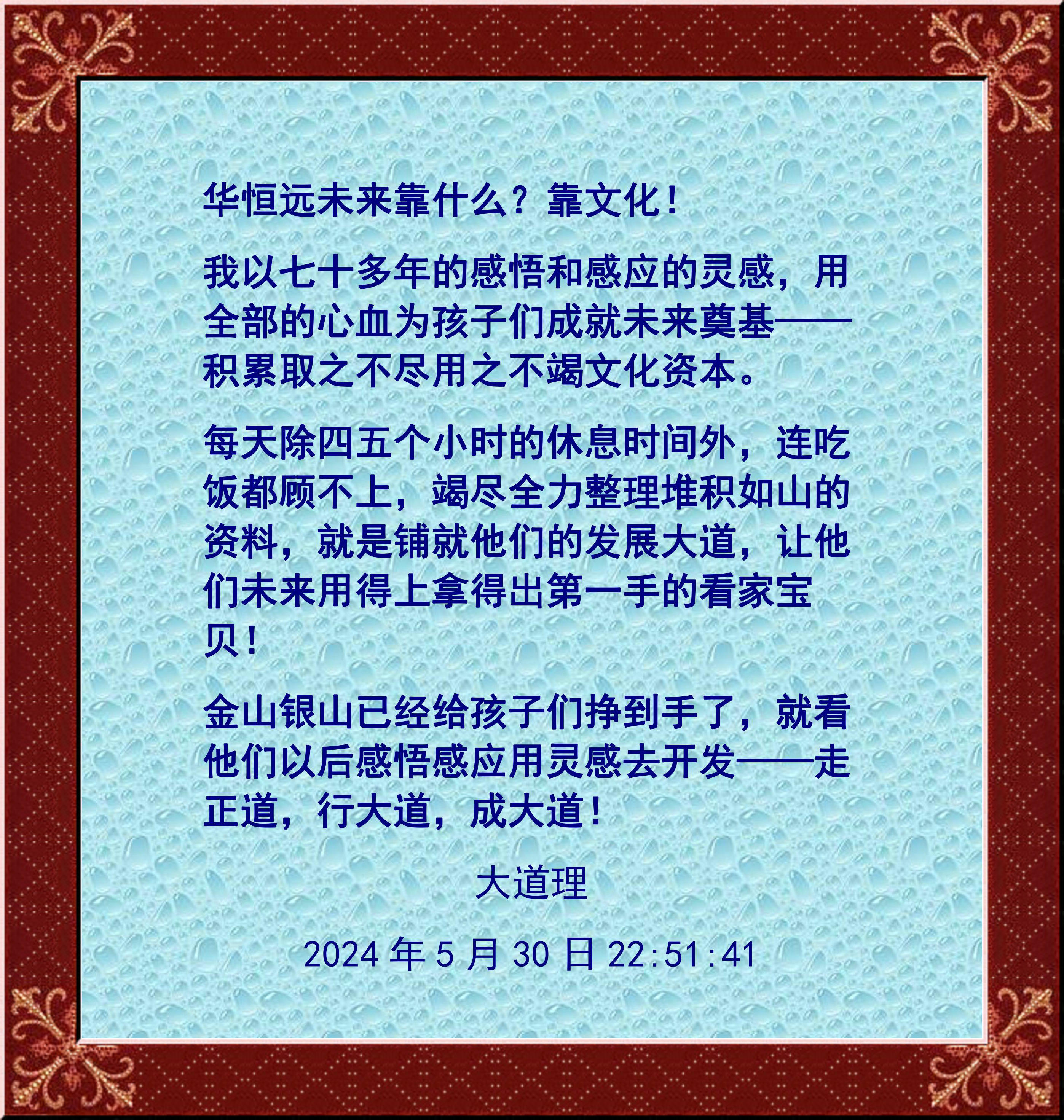 我以七十多年的感悟和感应的灵感,用全部的心血为孩子们成就未来奠基——积累取之不尽用之不竭文化资本。
