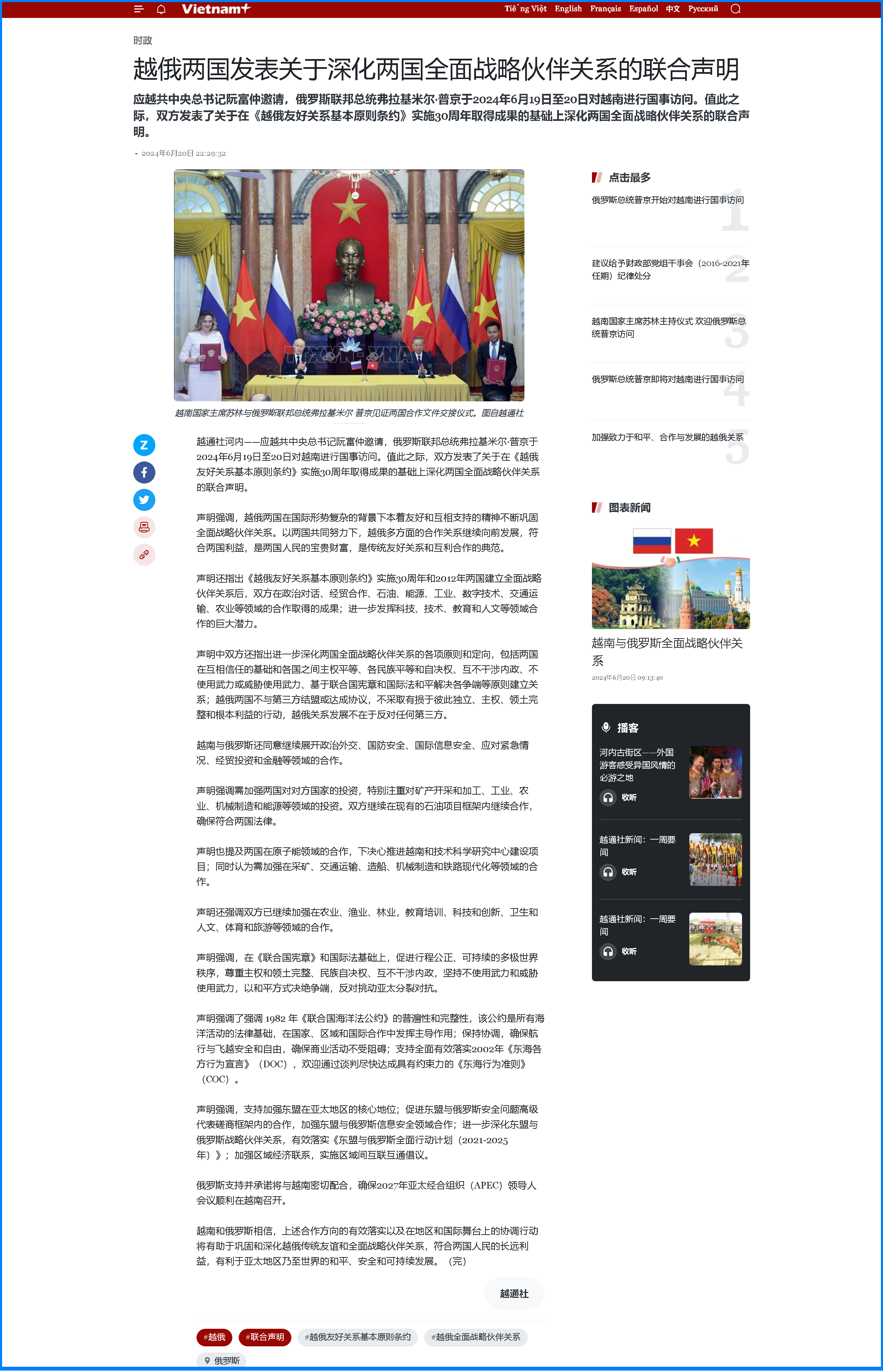 越南高度重视发展与俄罗斯的传统友谊和全面战略伙伴关系