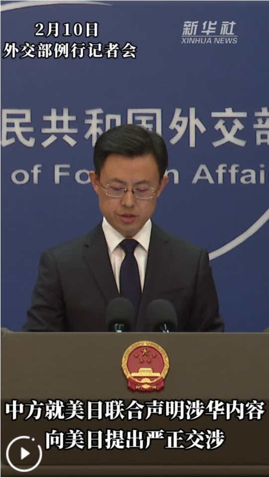 新华社北京2月10日电(记者朱超、邵艺博)外交部发言人郭嘉昆10日指出,近日发表的美日联合声明涉华内容公然干涉中国内政,攻击抹黑中国,渲染地区紧张局势,中方对此表示强烈不满,坚决反对。中方已向美方和日方提出严正交涉。