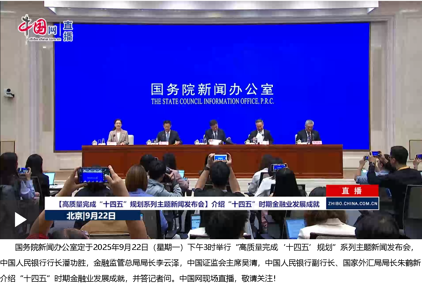 9月22日,国务院新闻办公室在北京举行“高质量完成‘十四五’规划”系列主题新闻发布会,中国人民银行行长潘功胜,金融监管总局局长李云泽,中国证监会主席吴清,中国人民银行副行长、国家外汇局局长朱鹤新介绍“十四五”时期金融业发展情况,并答记者问。新华社记者 李鑫 摄