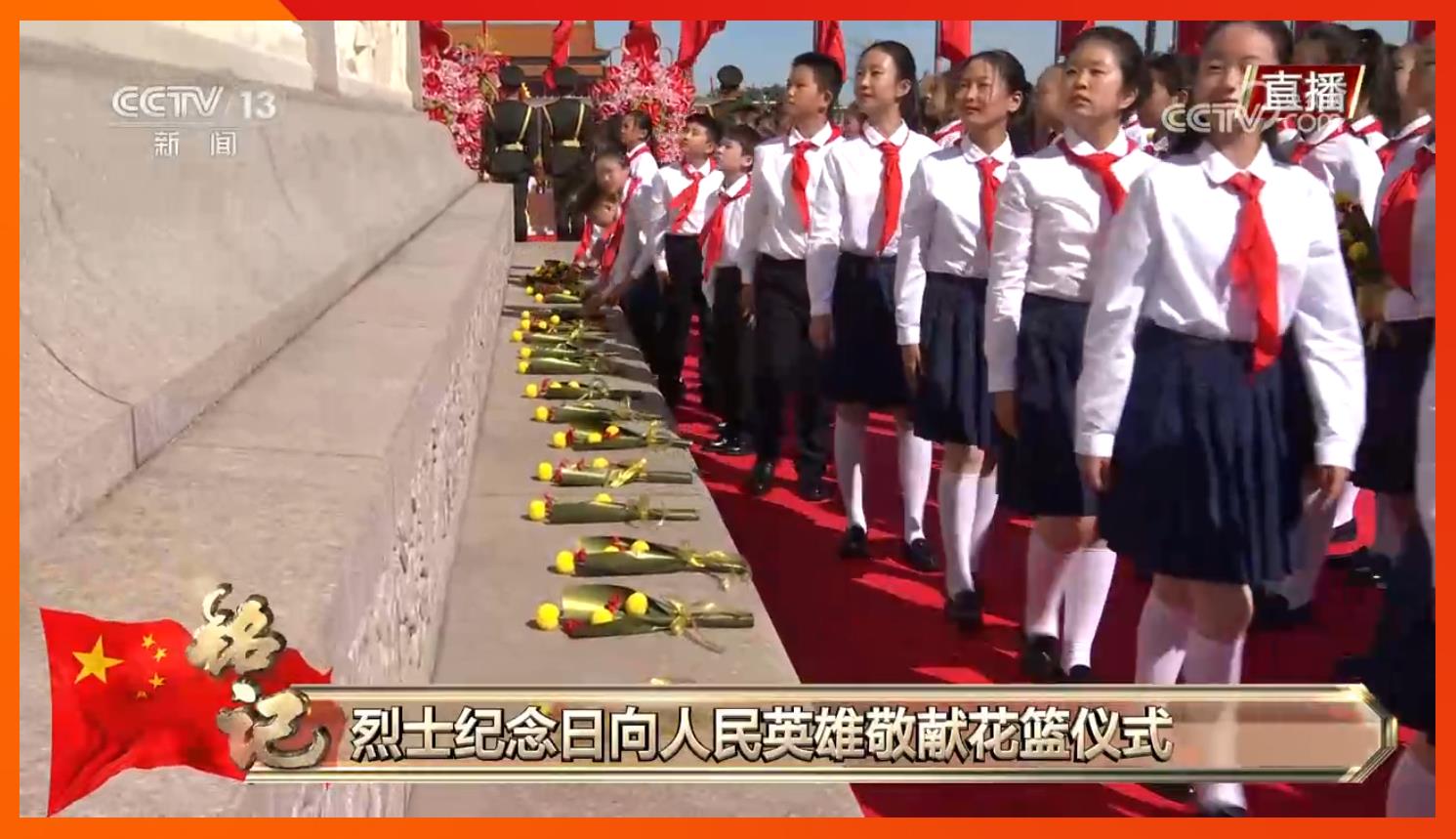 方阵前,以中共中央,全国人大常委会,国务院,全国政协,中央军委,各民主党派、全国工商联和无党派爱国人士,各人民团体和各界群众,老战士、老同志和烈士亲属,中国少年先锋队名义敬献的9个大型花篮一字排开,花篮红色缎带上书写的“人民英雄永垂不朽”格外醒目。