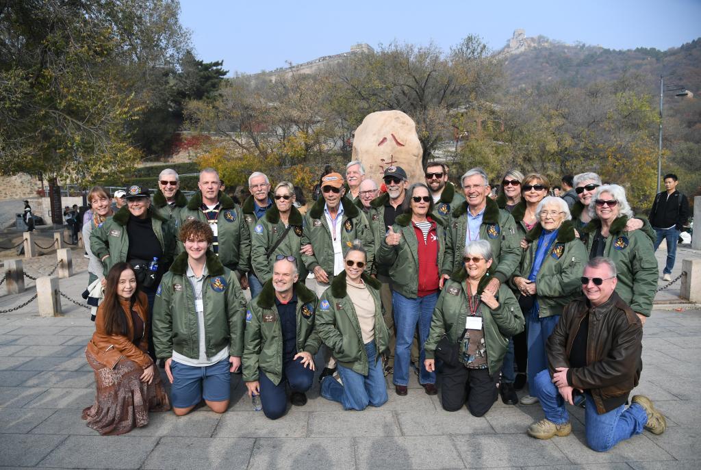 10月29日,飞虎队老兵莫耶一行人在北京八达岭长城合影留念。当日,美中航空遗产基金会访华代表团成员陆续抵达北京。新华社记者 任超 摄