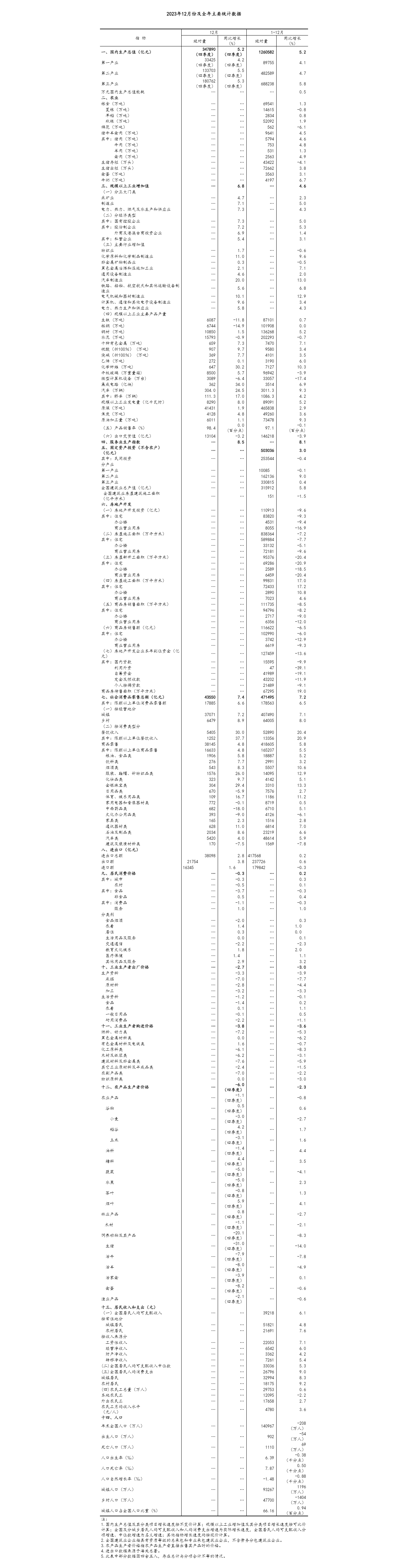 (1)国内生产总值及其分类项目增长速度按不变价计算,规模以上工业增加值及其分类项目增长速度按可比价计算,均为实际增长速度;其他指标除特殊说明外,按现价计算,为名义增长速度。