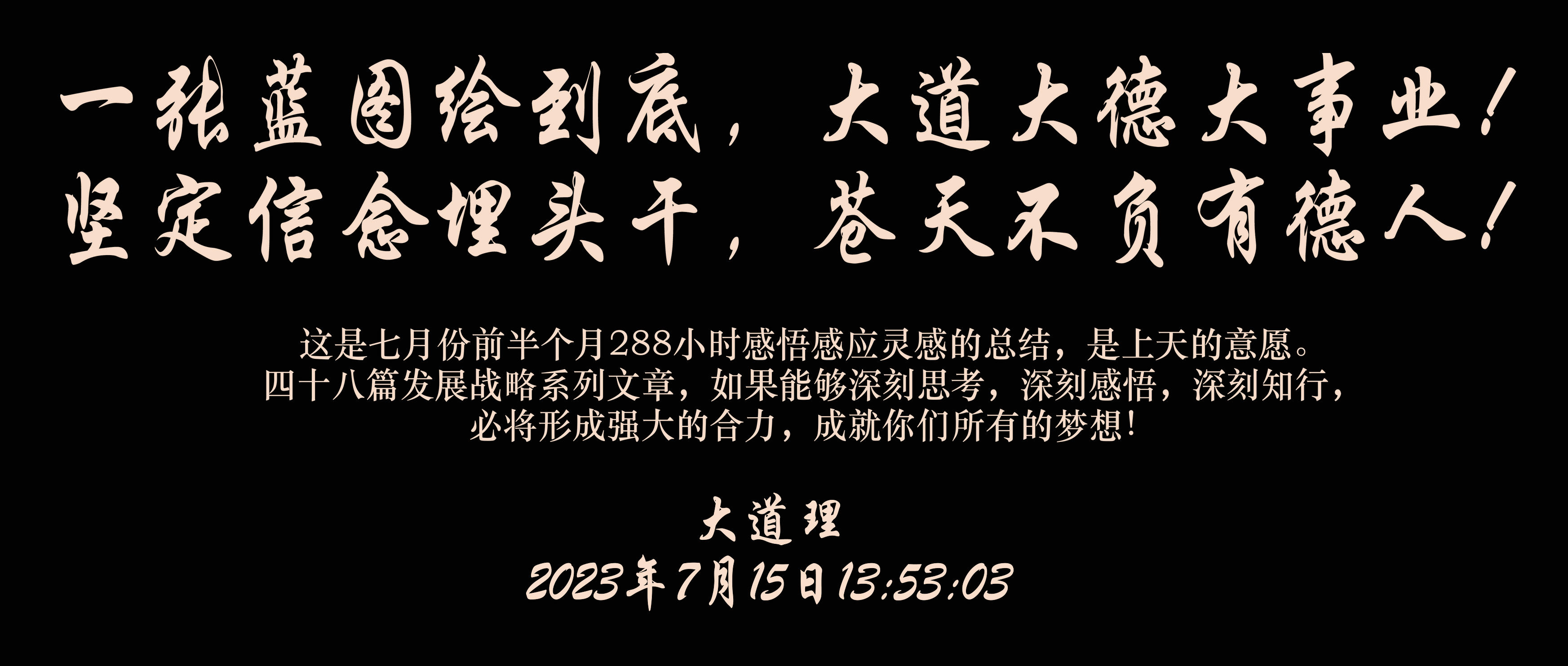 这是七月份前半个月288小时感悟感应灵感的总结,是上天的意愿。四十八篇发展战略系列文章,如果能够深刻思考,深刻感悟,深刻知行,必将形成强大的合力,成就你们所有的梦想!