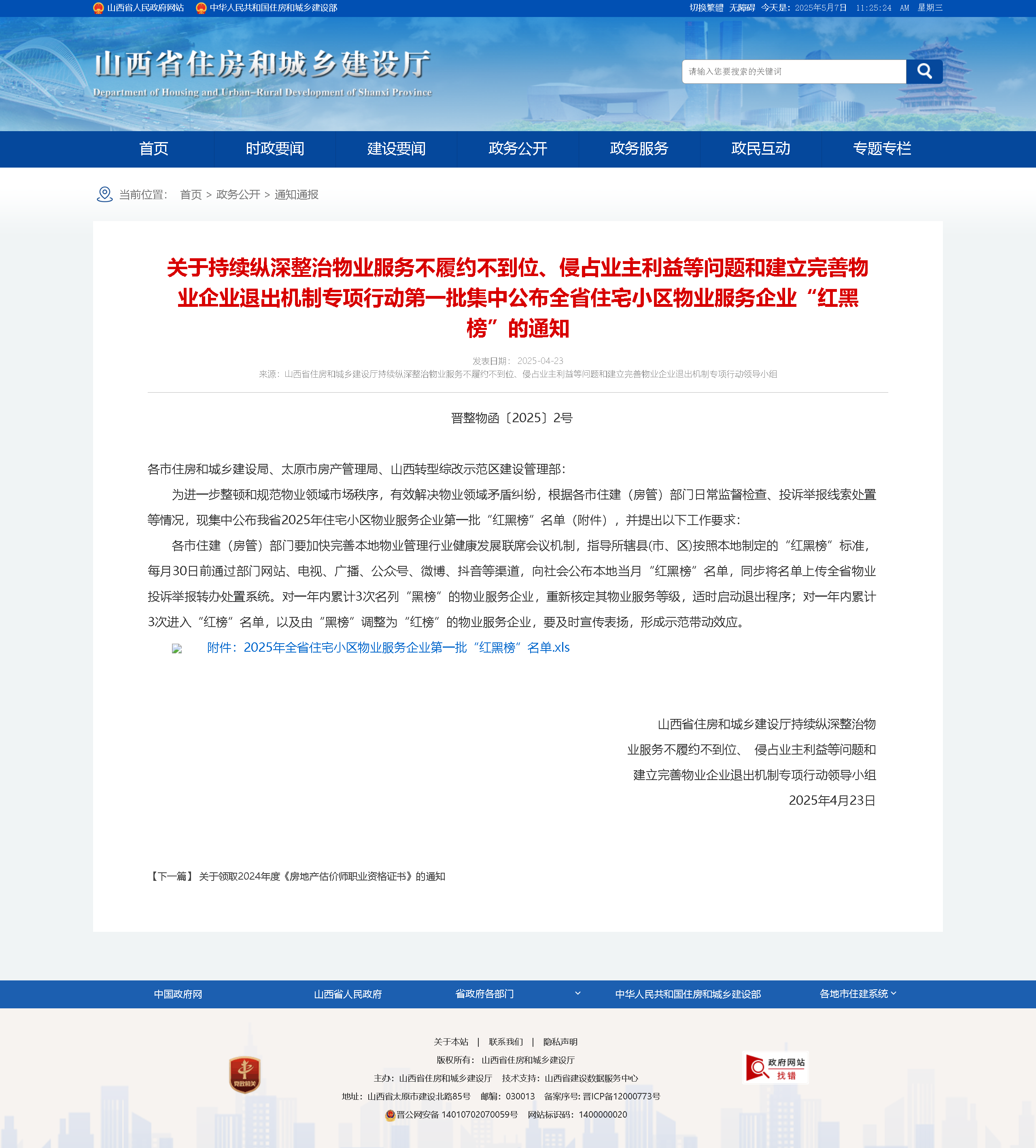 本报讯(记者晋帅妮)近日,为进一步整顿和规范物业领域市场秩序,有效解决物业领域矛盾纠纷,省住建厅根据各市住建(房管)部门日常监督检查、投诉举报线索处置等情况,公布我省2025年住宅小区物业服务企业第一批“红黑榜”名单,共计304家企业登上红榜,146家企业被列入黑榜。