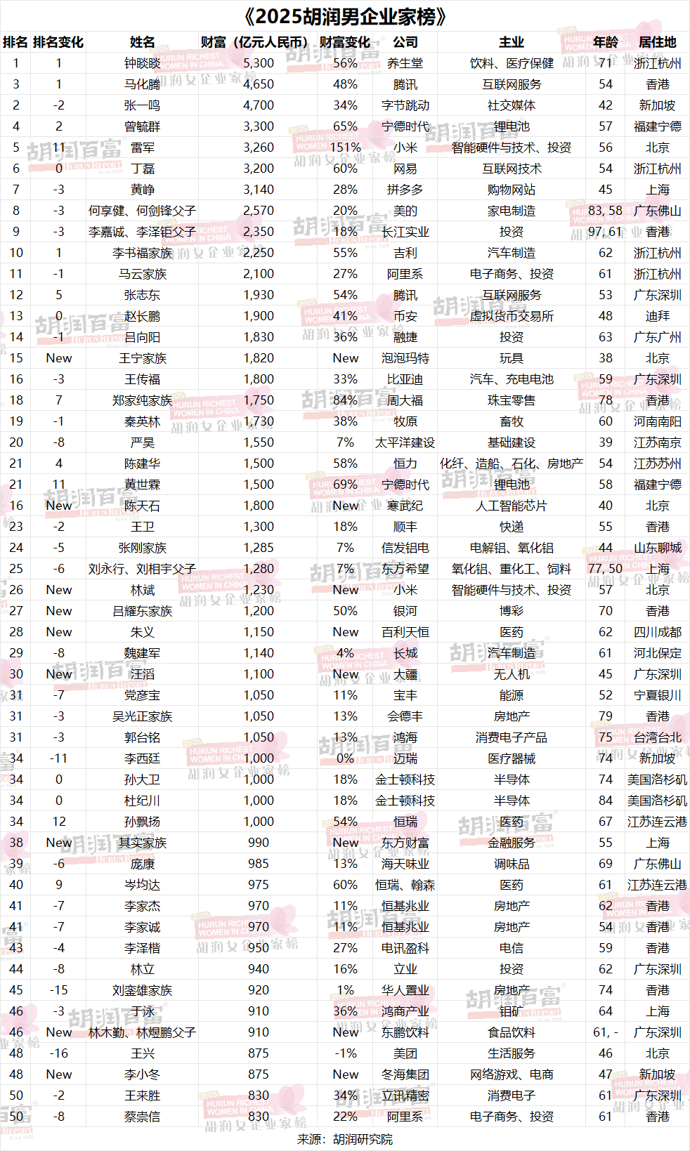上榜企业家上市公司财富计算的截止日期为2025年9月1日,美元与人民币的兑换比例按照1:7.13计算,港币与人民币的兑换比例按照1:0.92计算,新台币与人民币的兑换比例按照1:0.23计算。