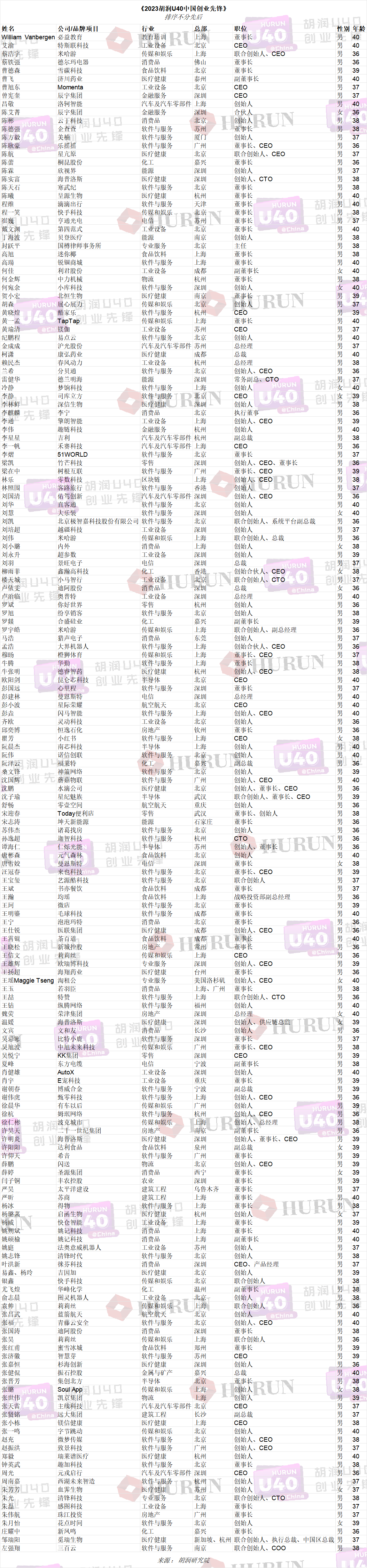 182位创业先锋荣登《2023胡润U40中国创业先锋》