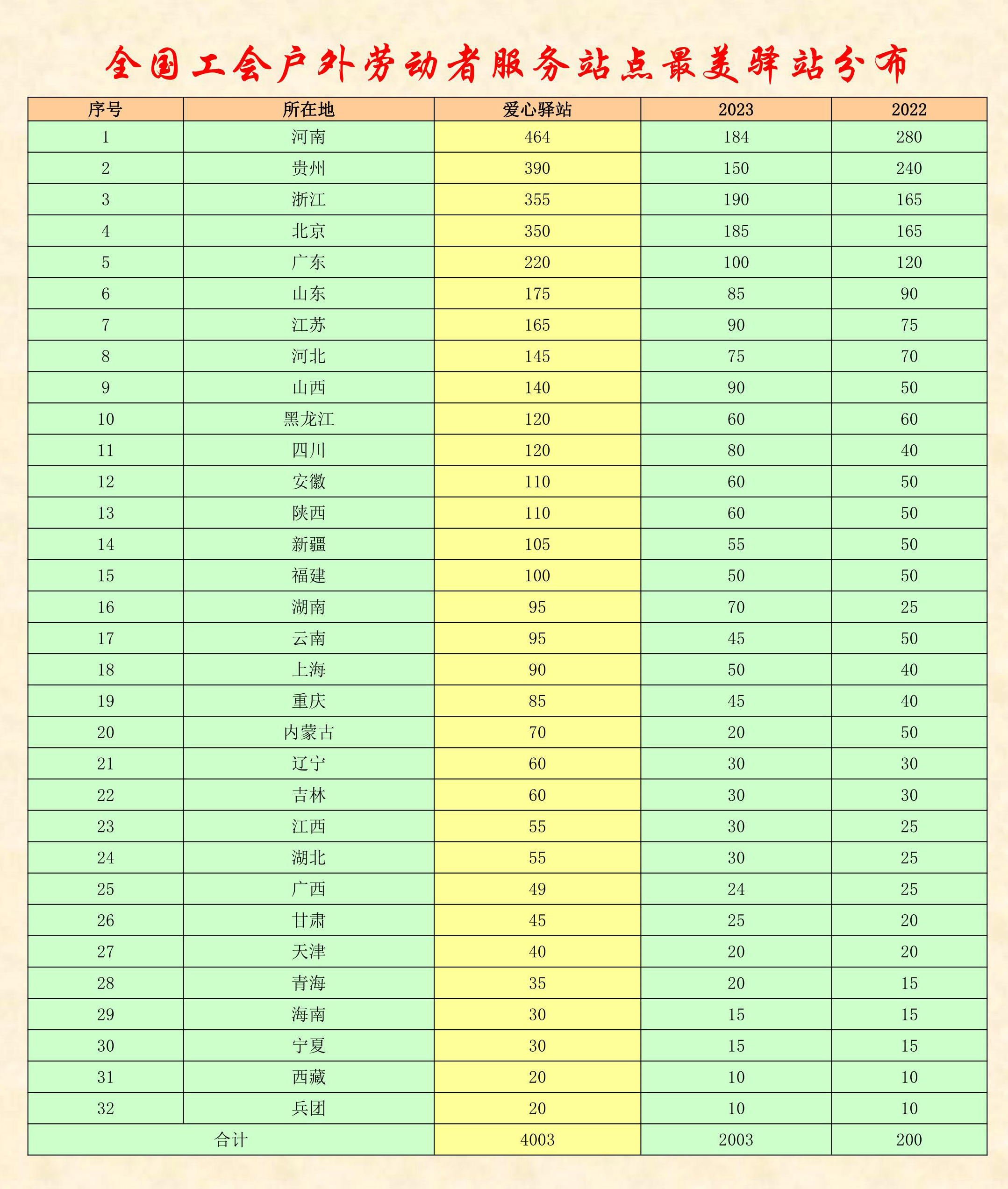山西日报记者杨文俊报道 12月14日,记者从省总工会获悉,在全国总工会发布的2023年“最美工会户外劳动者服务站点”名单中,全国2000个工会驿站被确认为2023年“最美驿站”,其中太原巡游网约车户外劳动者爱心驿站、大同市中石化大同友谊南街加油站户外劳动者爱心驿站等90个山西工会爱心驿站榜上有名。