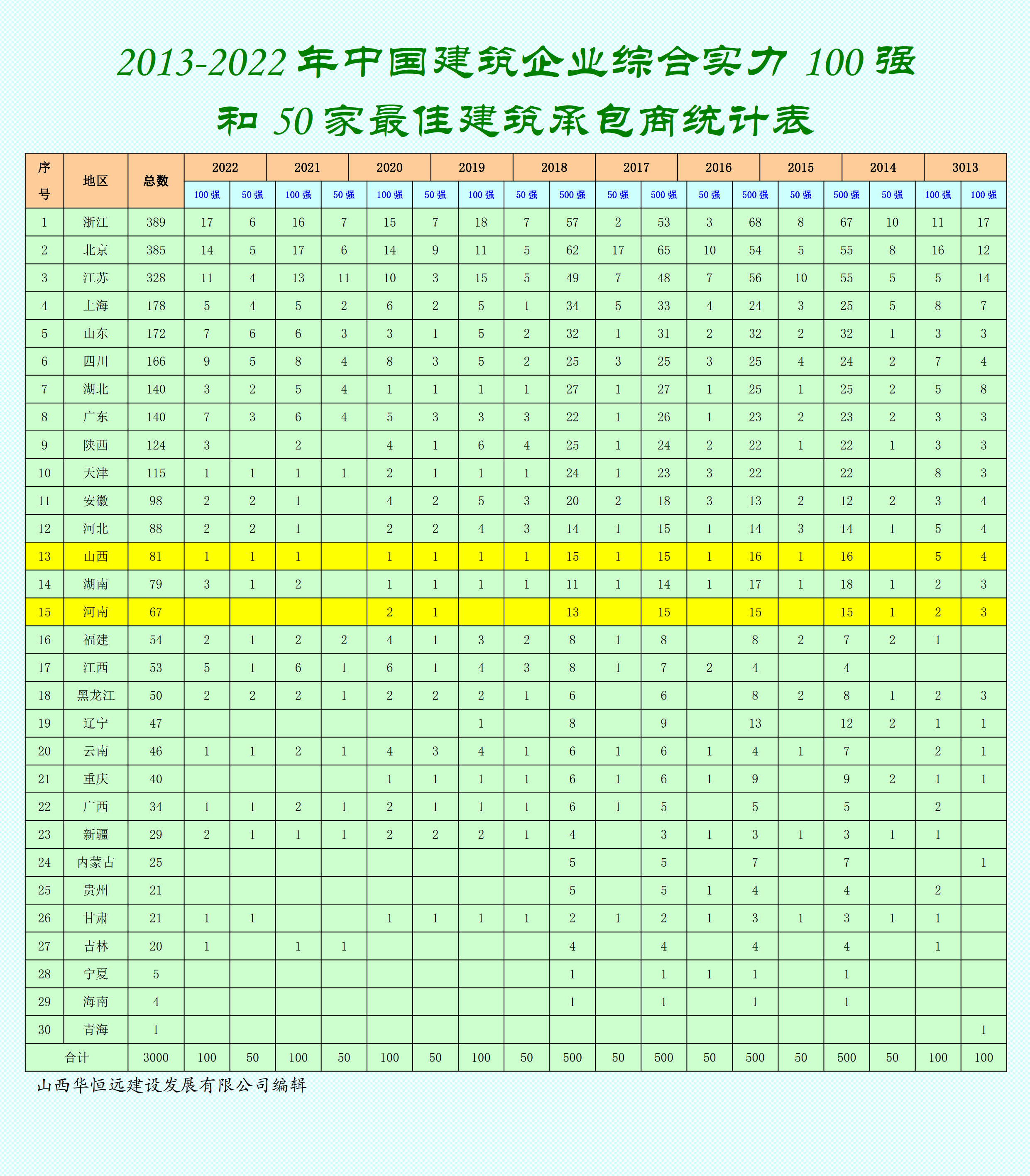 2013-2022年中国建筑企业综合实力100强和50家最佳建筑承包商排行榜?