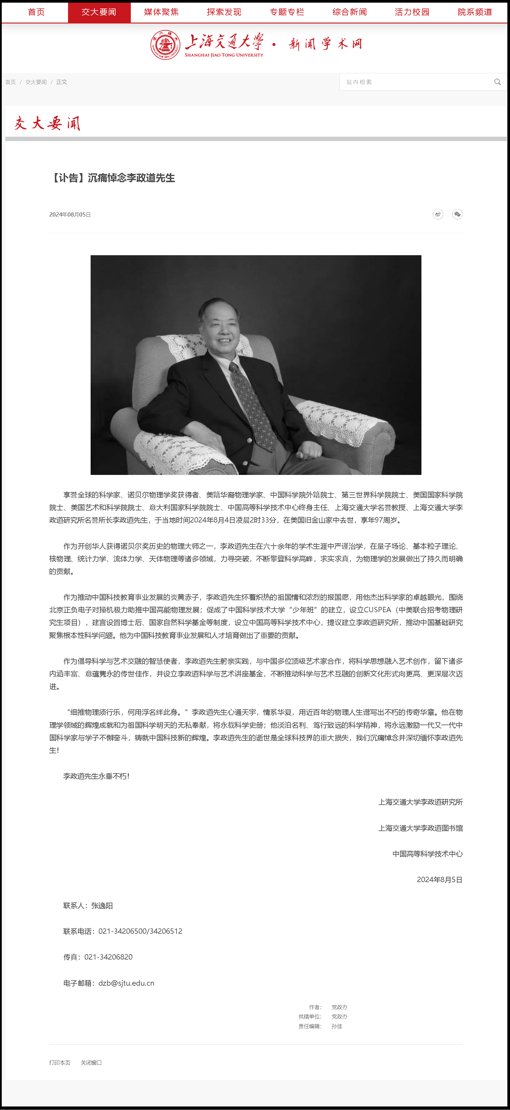 2024年8月5日,上海交通大学李政道研究所、上海交通大学李政道图书馆、中国高等科学技术中心发布讣告:享誉全球的科学家、诺贝尔物理学奖获得者、美籍华裔物理学家、中国科学院外籍院士、第三世界科学院院士、美国国家科学院院士、美国艺术和科学院院士、意大利国家科学院院士、中国高等科学技术中心终身主任、上海交通大学名誉教授、上海交通大学李政道研究所名誉所长李政道先生,于当地时间2024年8月4日凌晨2时33分,在美国旧金山家中去世,享年97周岁。