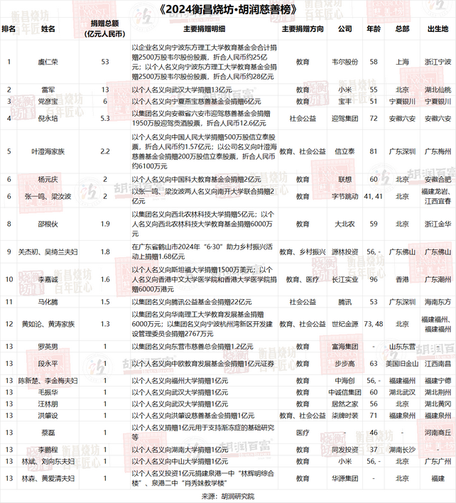 No13 ¥ 1 亿 洪肇设 教育、社会公益