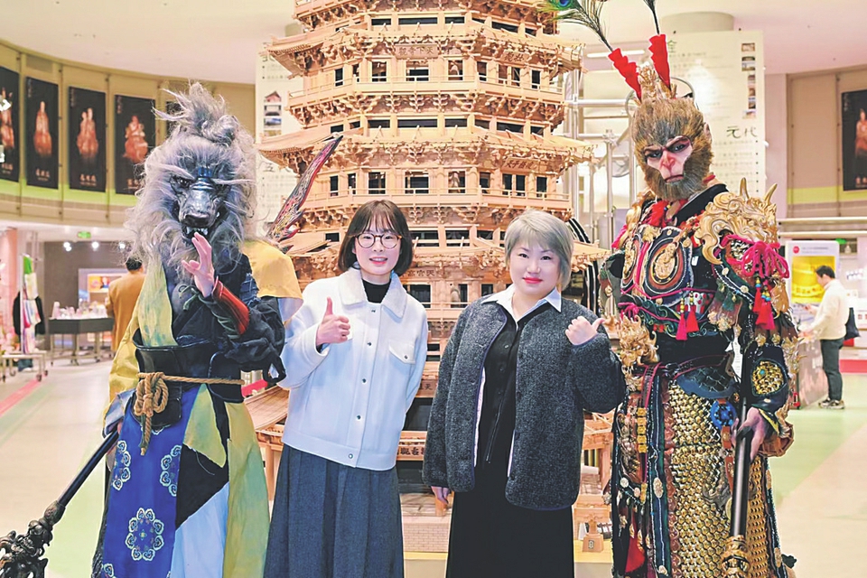 展览现场,参观者与“悟空”等IP形象合影。本报记者栗美霞摄