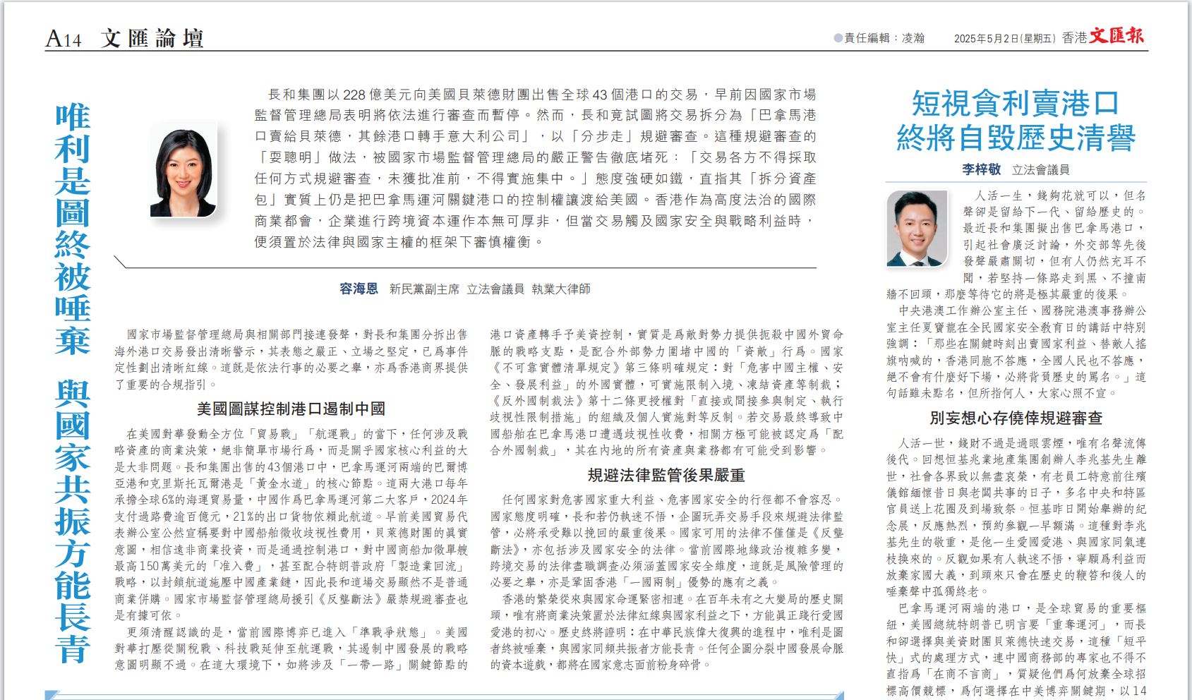 长和集团以228亿美元向美国贝莱德财团出售全球43个港口的交易,早前因国家市场监督管理总局表明将依法进行审查而暂停。然而,长和竟试图将交易拆分为「巴拿马港口卖给贝莱德,其余港口转手意大利公司」,以「分步走」规避审查。这种规避审查的「耍聪明」做法,被国家市场监督管理总局的严正警告彻底堵死:「交易各方不得采取任何方式规避审查,未获批准前,不得实施集中。」态度强硬如铁,直指其「拆分资产包」实质上仍是把巴拿马运河关键港口的控制权让渡给美国。香港作为高度法治的国际商业都会,企业进行跨境资本运作本无可厚非,但当交易触及国家安全与战略利益时,便须置于法律与国家主权的框架下审慎权衡。