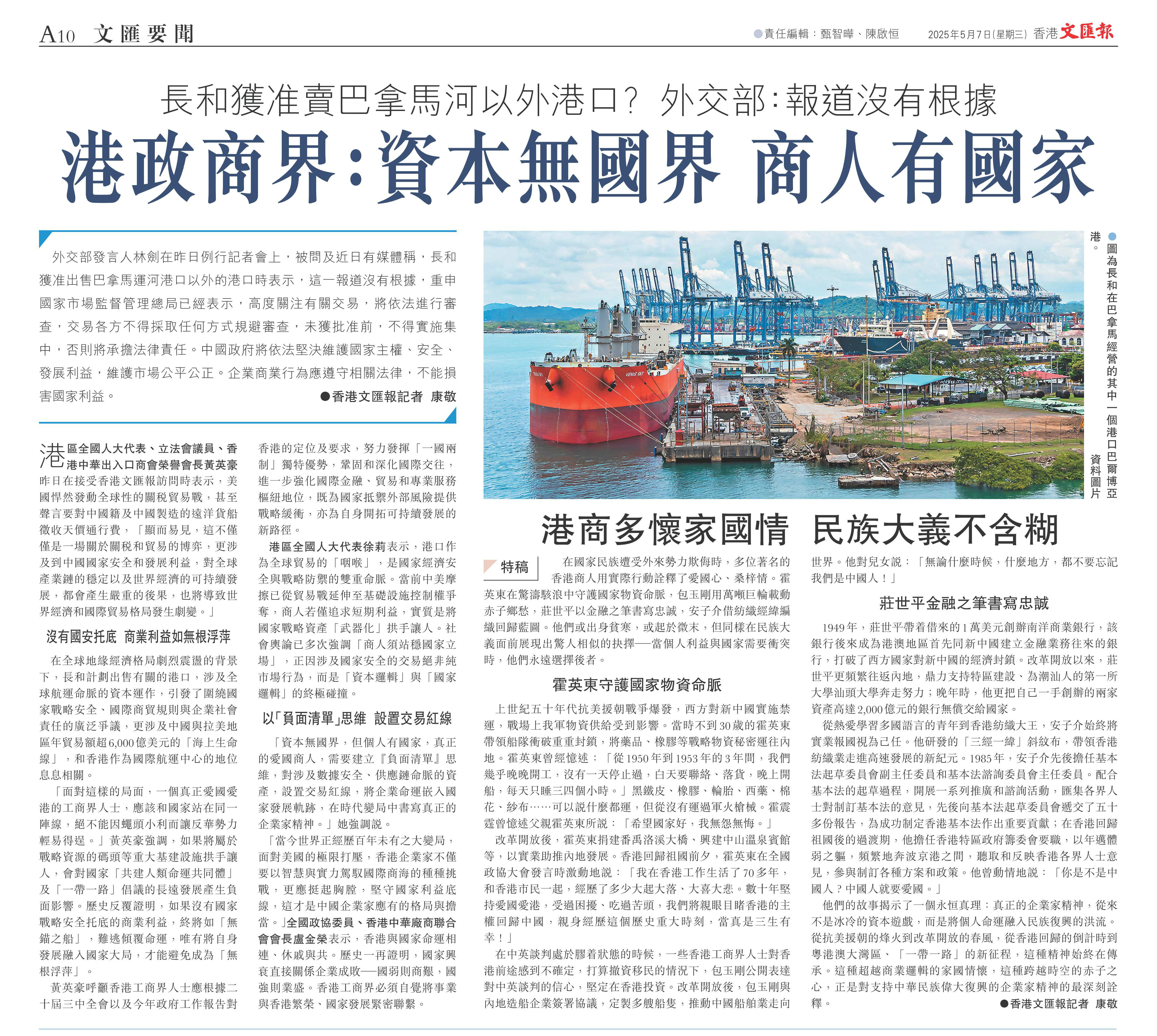 他们的故事揭示了一个永恒真理:真正的企业家精神,从来不是冰冷的资本游戏,而是将个人命运融入民族复兴的洪流。从抗美援朝的烽火到改革开放的春风,从香港回归的倒计时到粤港澳大湾区、「一带一路」的新征程,这种精神始终在传承。这种超越商业逻辑的家国情怀,这种跨越时空的赤子之心,正是对支持中华民族伟大复兴的企业家精神的最深刻诠释。 ●香港文汇报记者康敬