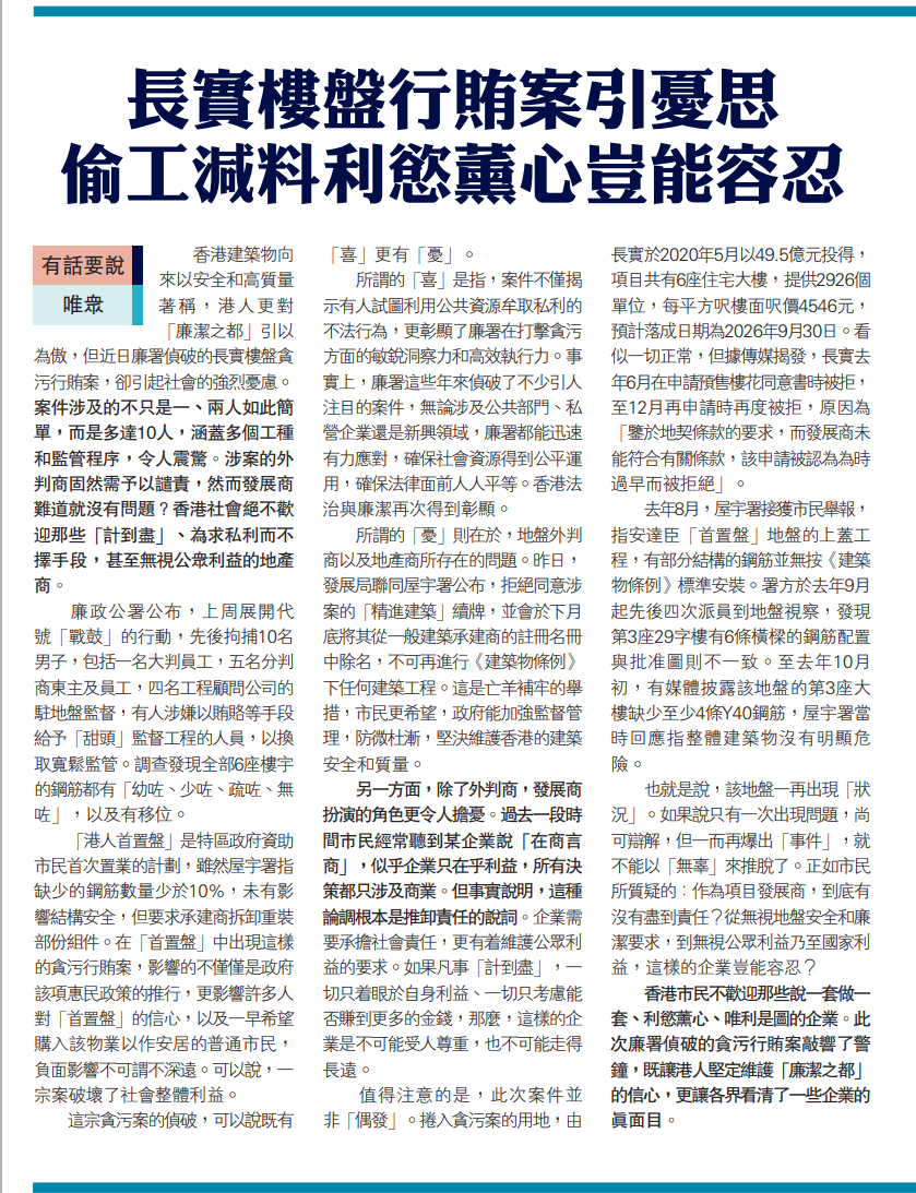 香港建筑物向来以安全和高质量著称,港人更对「廉洁之都」引以为傲,但近日廉署侦破的长实楼盘贪污行贿案,却引起社会的强烈忧虑。案件涉及的不只是一、两人如此简单,而是多达10人,涵盖多个工种和监管程序,令人震惊。涉案的外判商固然需予以谴责,然而发展商难道就没有问题?香港社会绝不欢迎那些「计到尽」、为求私利而不择手段,甚至无视公众利益的地产商。