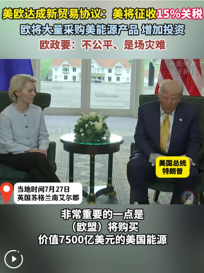 美国总统特朗普和欧盟委员会主席冯德莱恩27日在位于英国苏格兰南艾尔郡的特恩贝里高尔夫球场共同宣布,美欧达成新贸易协议,美国将对欧盟输美产品征收15%的关税。欧盟将对美增加6000亿美元投资及购买价值7500亿美元的美国能源等。