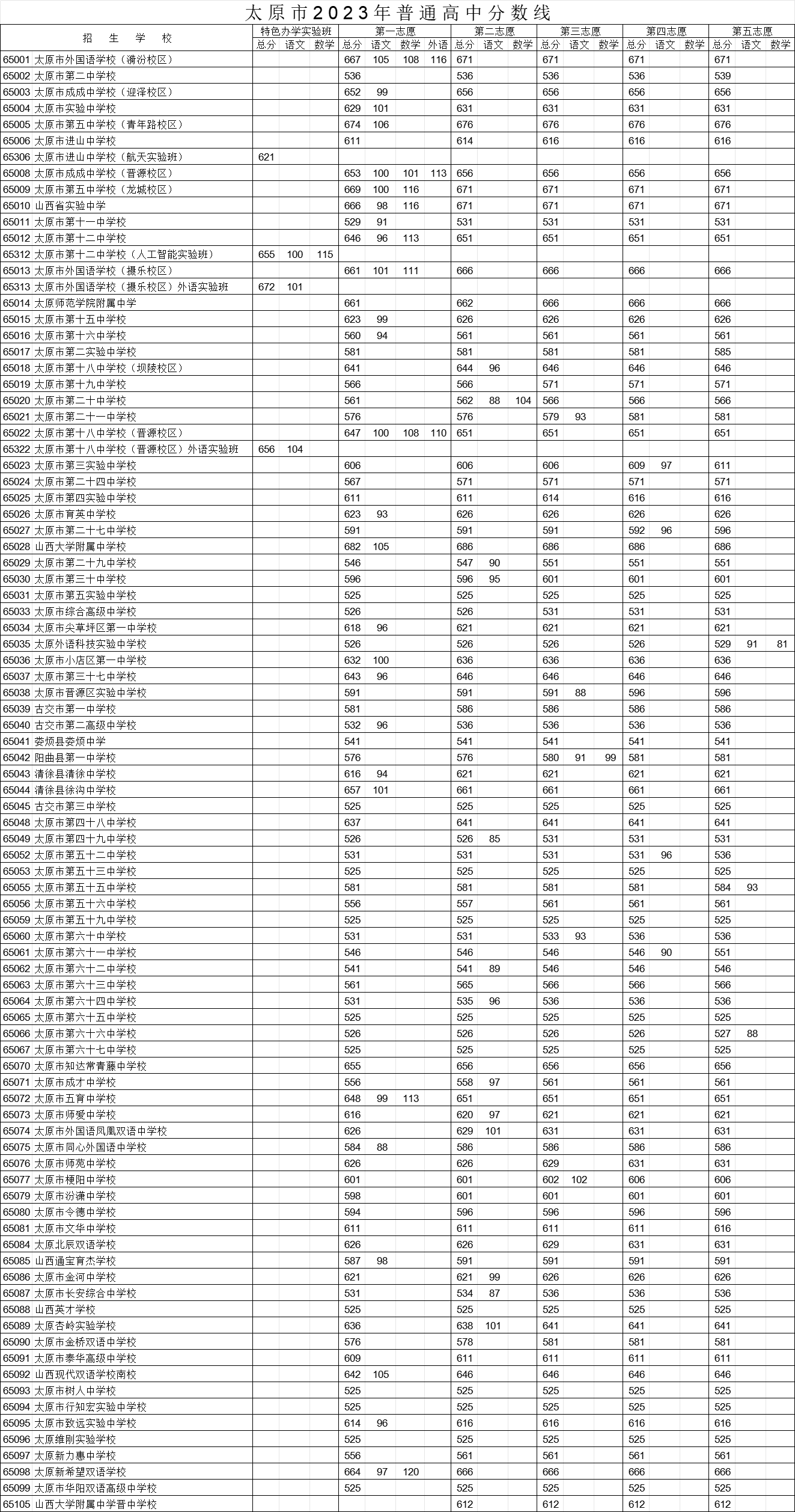 太原市进山中学校航天实验班、太原市第十二中学校人工智能实验班、太原市外国语学校(摄乐校区)外语实验班、太原市第十八中学校(晋源校区)外语实验班,分数线控制在中考总分85%(2023年为621分)的基础上,按计划、按分数、按志愿择优录取;进山中学初中航天实验班在籍考生填报本校航天实验班志愿,在全市普通高中最低录取控制线上按招生计划优先择优录取。