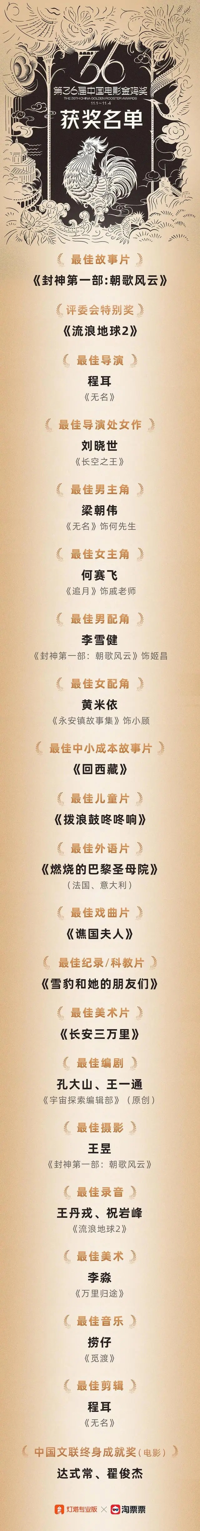 新华社厦门11月4日电(记者王鹏、颜之宏)第36届中国电影金鸡奖4日晚在福建厦门揭晓。《封神第一部:朝歌风云》获最佳故事片奖,梁朝伟、何赛飞分别获得最佳男主角奖和最佳女主角奖。
