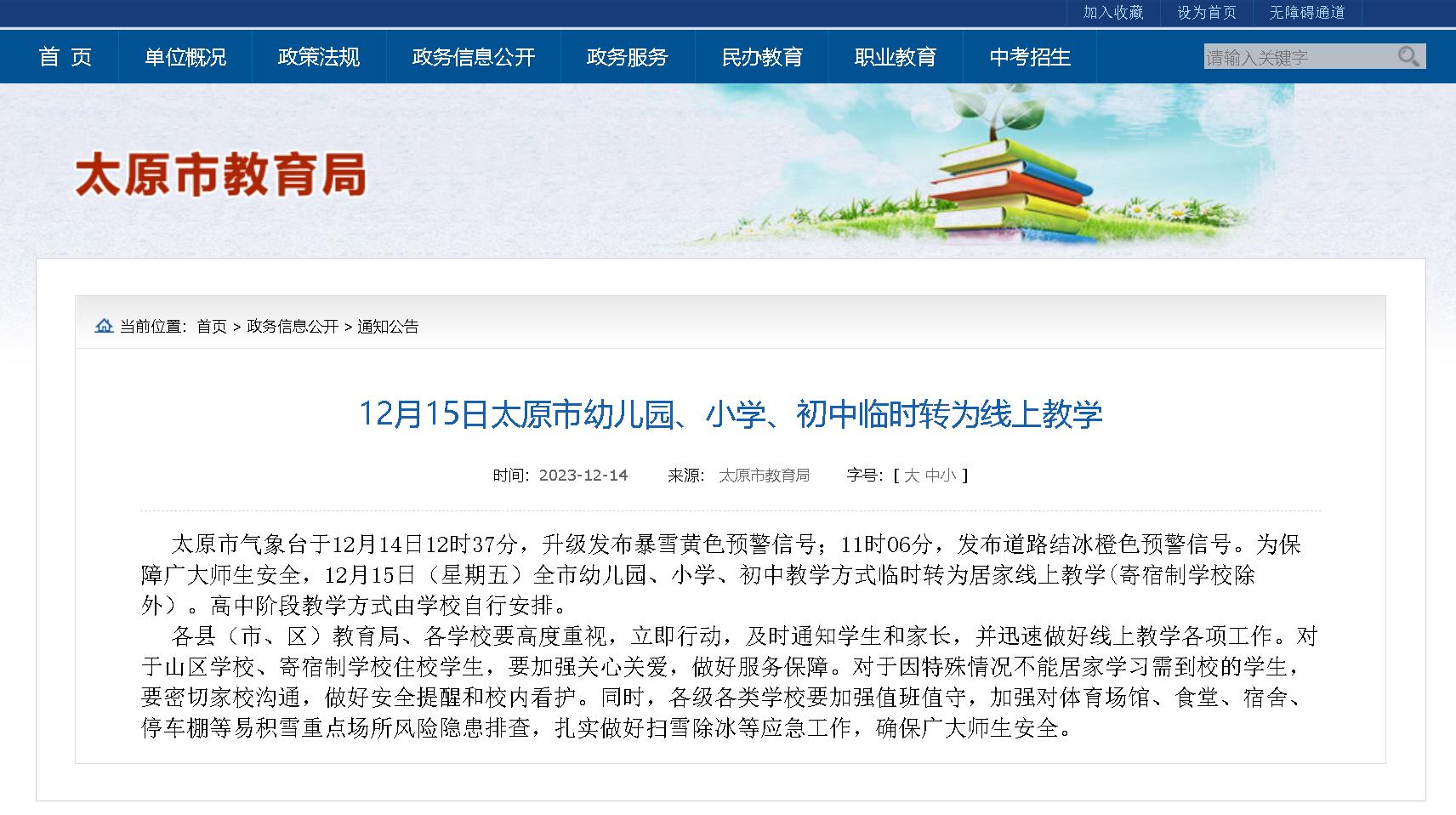太原市气象台于12月14日12时37分,升级发布暴雪黄色预警信号;11时06分,发布道路结冰橙色预警信号。为保障广大师生安全,太原市教育局发布:12月15日(星期五)太原市幼儿园、小学、初中教学方式临时转为居家线上教学。高中阶段教学方式由学校自行安排。