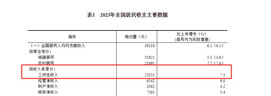 按收入来源分,2023年,全国居民人均工资性收入22053元,增长7.1%,占可支配收入的比重为56.23%。