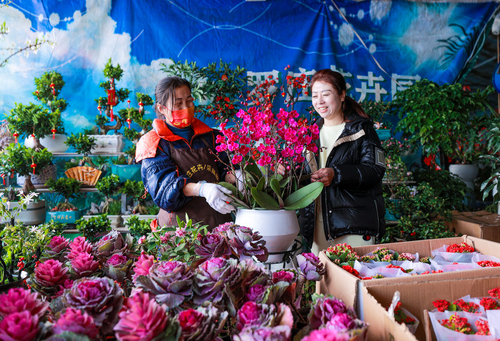 2月4日,在罗庄花卉市场,整齐摆放的蝴蝶兰,色泽鲜艳、外形美观,不同品种的百合花含苞待放、香气迷人,还有冬青、杜鹃、茶花等一簇簇鲜花争奇斗艳、吐露芬芳。因为离城区较近,便利的交通和品种多样的花卉,吸引了不少市民前来选购,有携家人前来挑选的、有三两好友相约前来观赏的,市场内热闹非凡。为满足群众节日期间购买花卉的需求,罗庄花卉市场新引进了多个品种的鲜花种类可供市民挑选购买。现在过春节,越来越多的市民喜欢用鲜花来装点一下居室,讨一个好彩头。(李红卫)