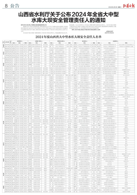 根据《水库大坝安全管理条例》,按照省政府办公厅《关于加强水库安全管理工作的意见》(晋政办发〔2023〕59号)和水利部办公厅《关于落实2024年水库大坝安全责任人的通知》(办运管函〔2024〕52号)要求,现将2024年度全省83座大中型水库大坝安全责任人名单予以公布。
