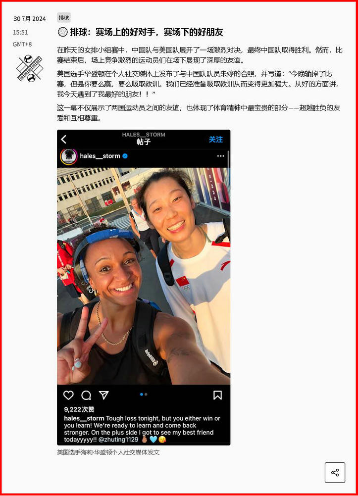 美国选手华盛顿在个人社交媒体上发布了与中国队队员朱婷的合照,并写道:“今晚输掉了比赛,但是你要么赢,要么吸取教训。我们已经准备吸取教训从而变得更加强大。从好的方面讲,我今天遇到了我最好的朋友!!”