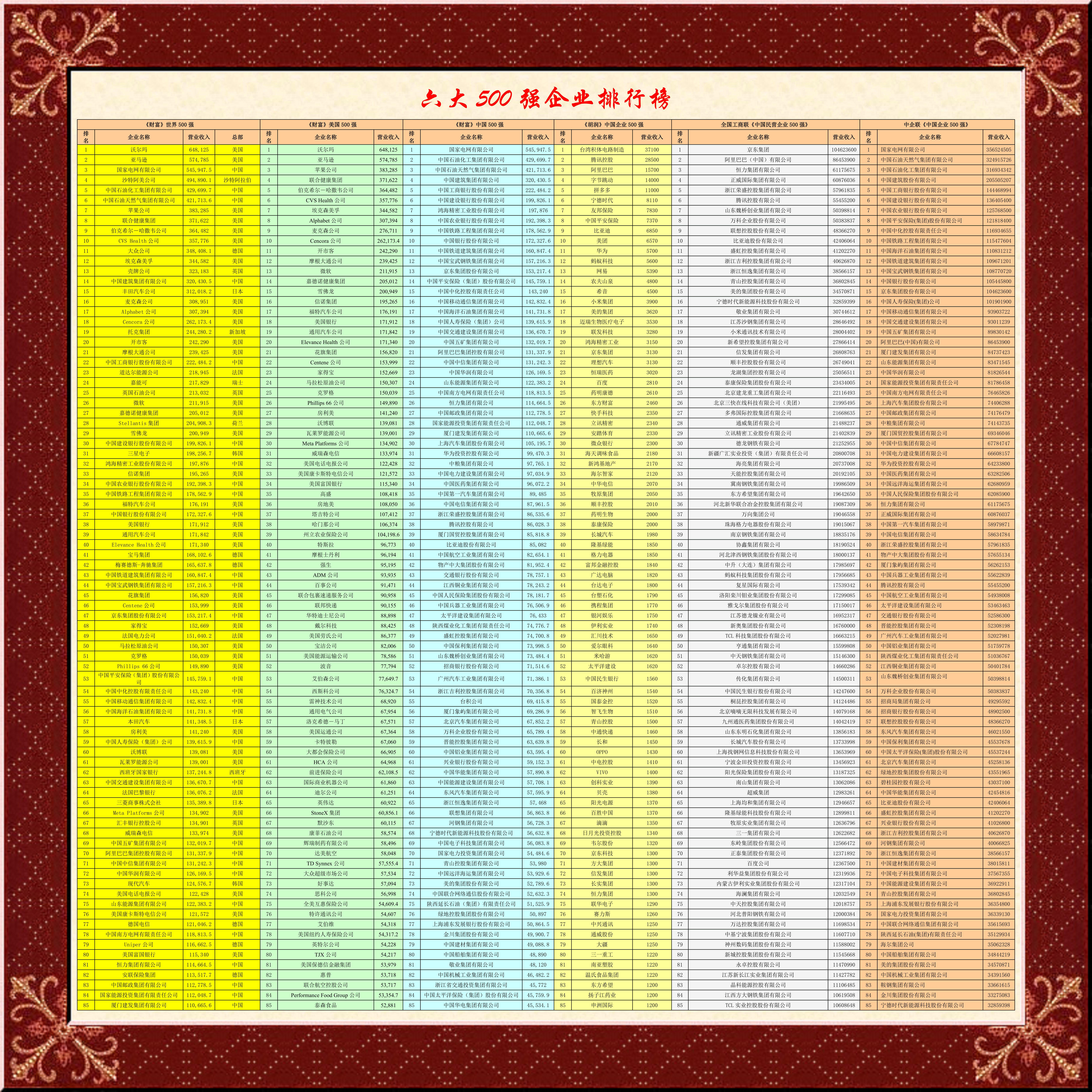 《财富》世界500强、美国500强、中国500强,胡润《中国500强》,中企联《中国企业500强》和全国工商联《中国民营企业500强》六大榜单,我们纵横比较一下,看看高低差距。