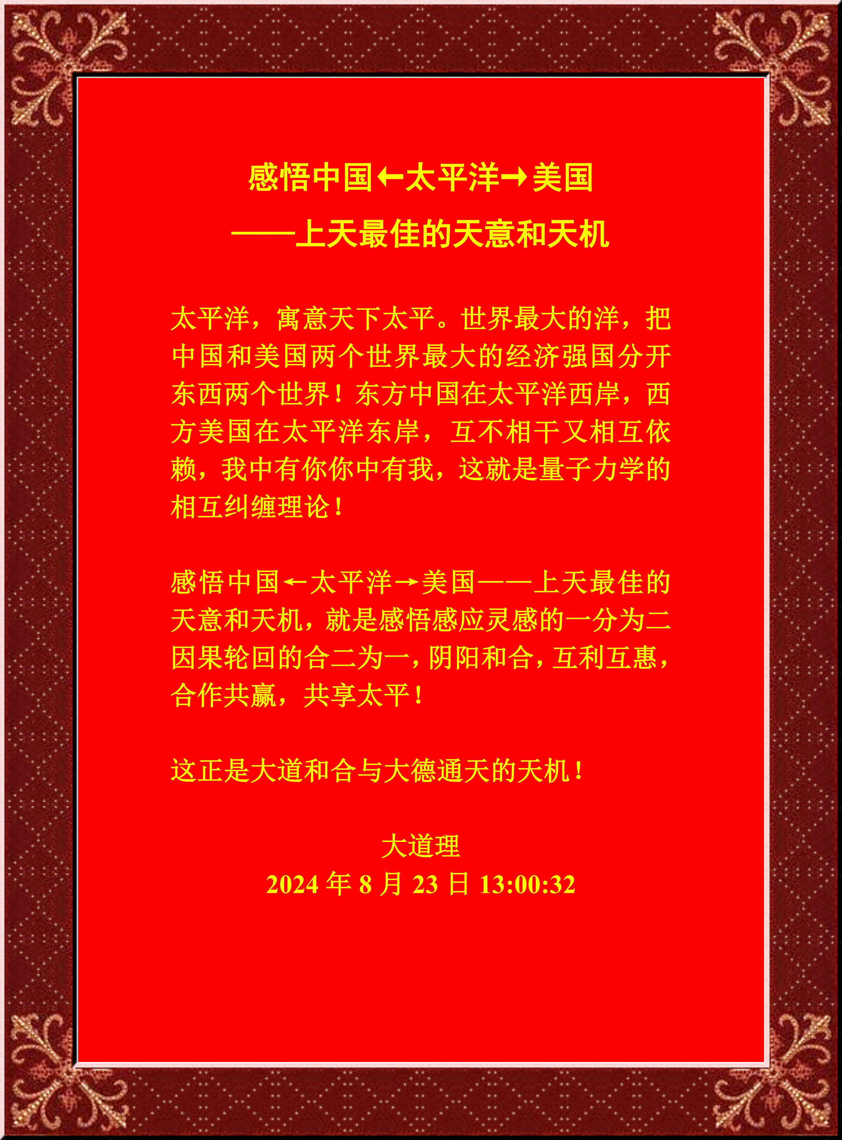 感悟中国←太平洋→美国——上天最佳的天意和天机,就是感悟感应灵感的一分为二因果轮回的合二为一,阴阳和合,互利互惠,合作共赢,共享太平!