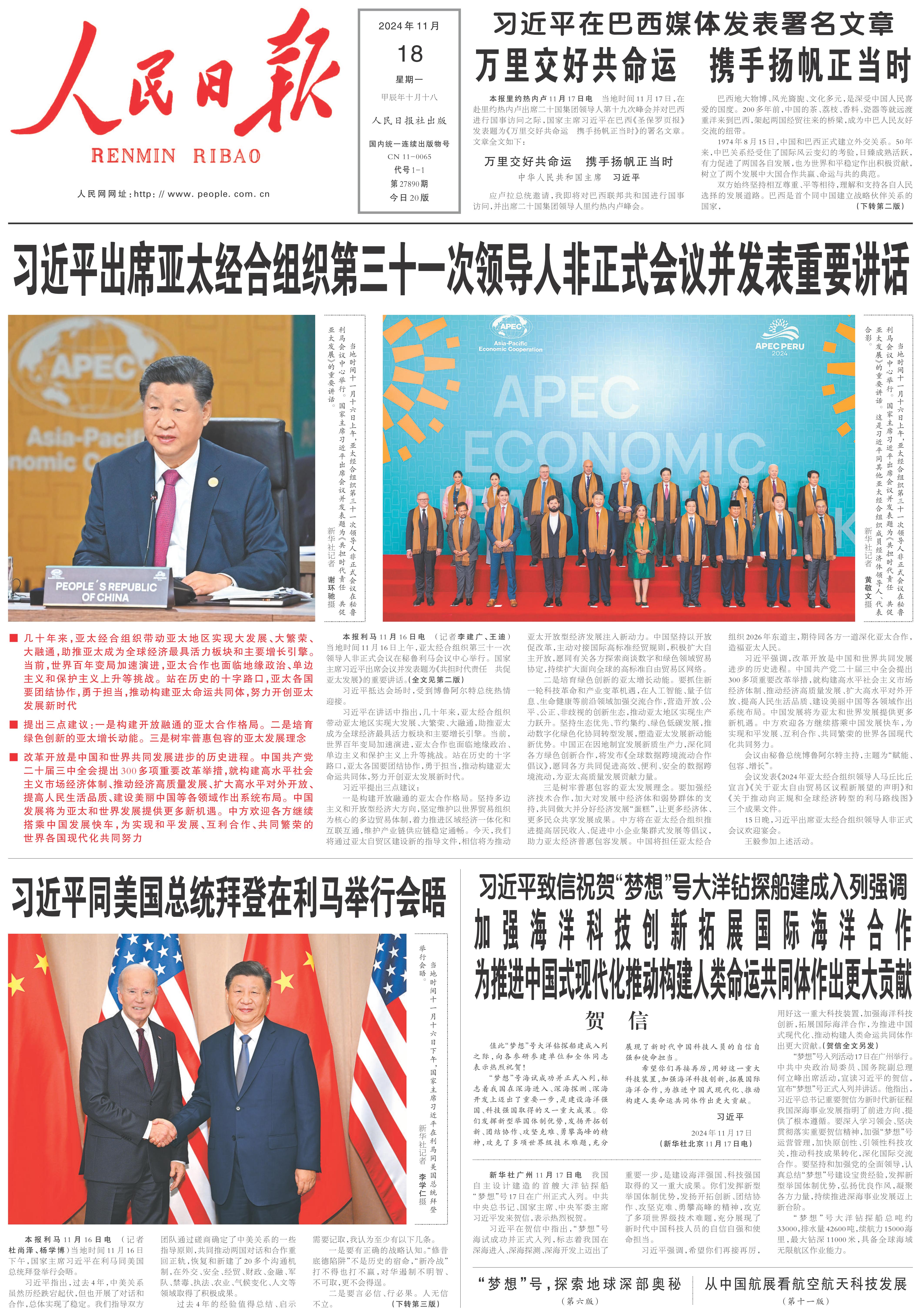 16日上午,亚太经合组织第三十一次领导人非正式会议在秘鲁利马会议中心举行。习近平主席出席会议并发表题为《共担时代责任 共促亚太发展》的重要讲话。