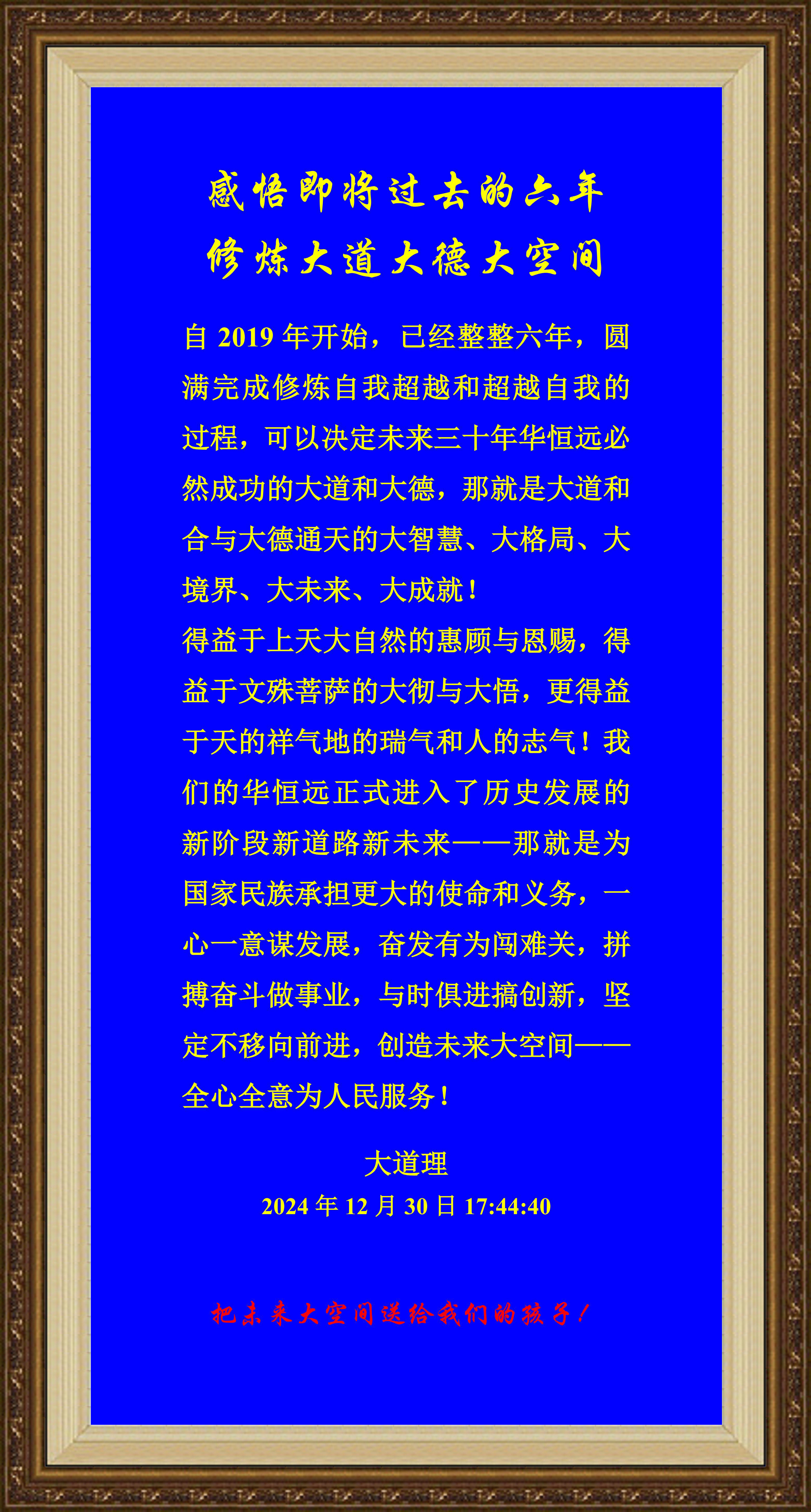 自2019年开始,已经整整六年,圆满完成修炼自我超越和超越自我的过程,可以决定未来三十年k1体育必然成功的大道和大德,那就是大道和合与大德通天的大智慧、大格局、大境界、大未来、大成就!