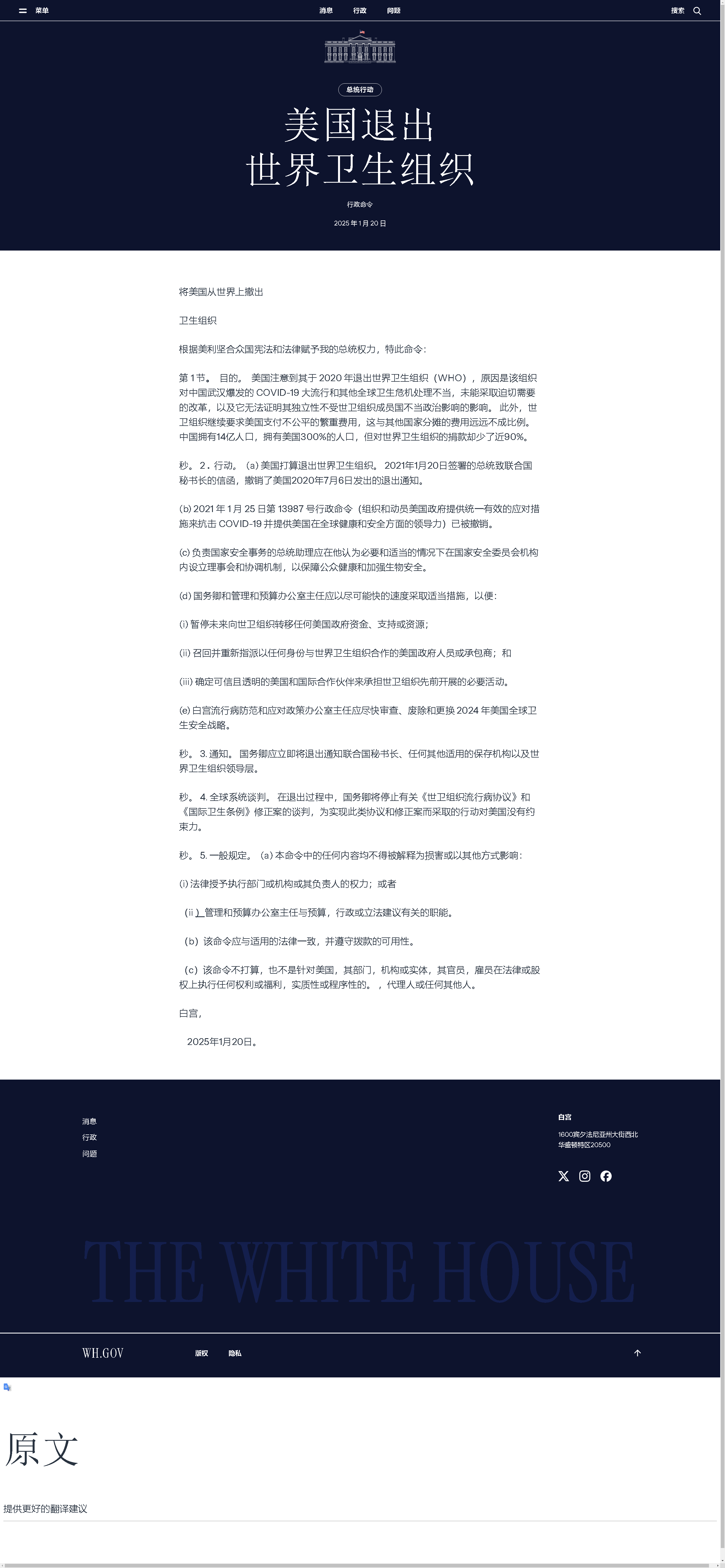 白宫发布的行政令称,美国国务卿应将美国这一决定立即通知联合国秘书长和世卫组织领导层。行政令还要求尽快采取适当措施,暂停向世卫组织提供任何来自美国政府的资金、支持和资源。