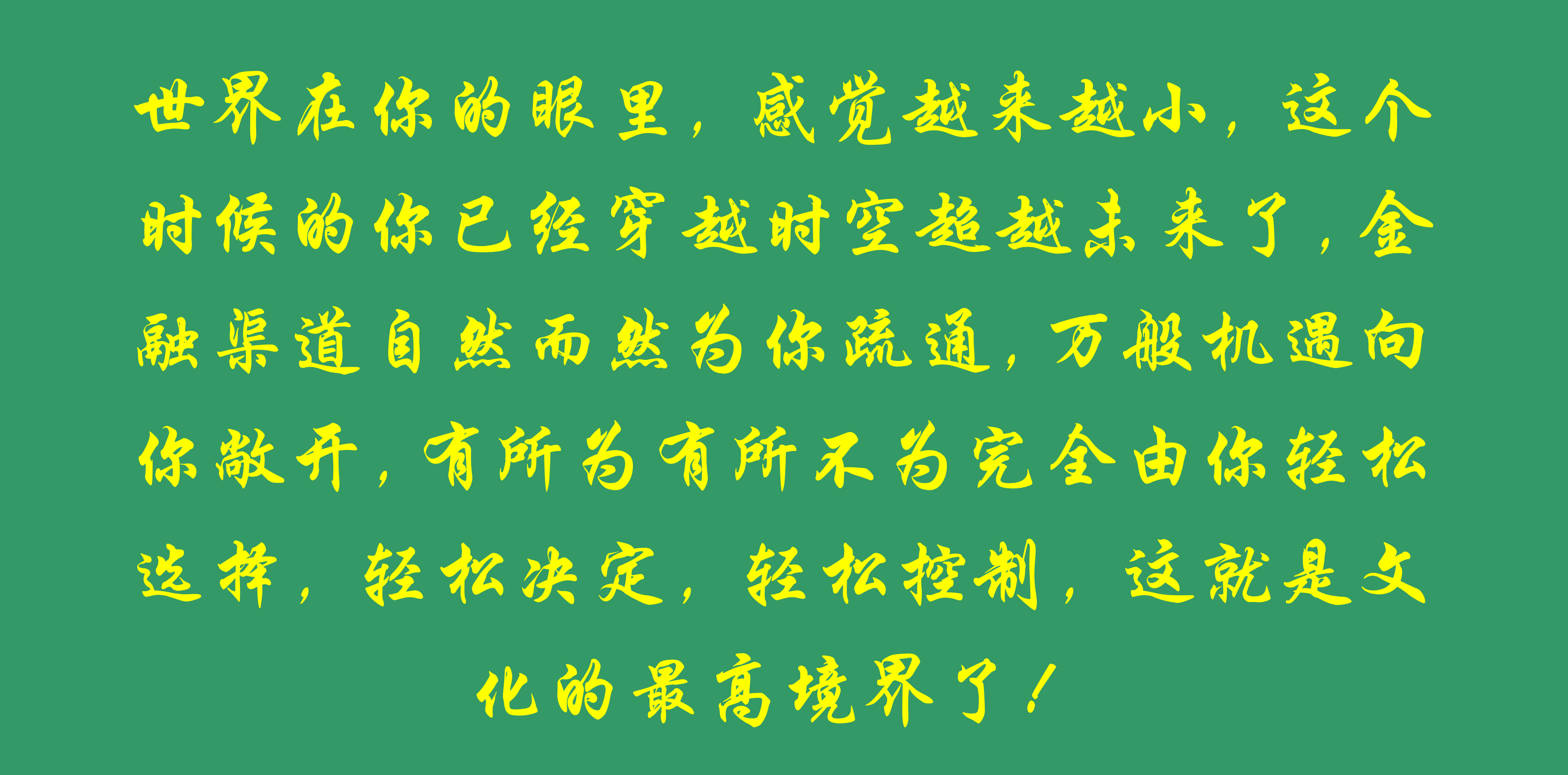 做一个企业家,一个世界级的大企业家,必须有高度的觉悟,高度的责任,高度的主动,这就是使命感和事业心的高度统一,高度融合,高度完善。上升到这个高度,你的公司才能越做越大,越做越强,越做越优。世界在你的眼里,感觉越来越小,这个时候的你已经穿越时空超越未来了,金融渠道自然而然为你疏通,万般机遇向你敞开,有所为有所不为完全由你轻松选择,轻松决定,轻松控制,这就是文化的最高境界了!