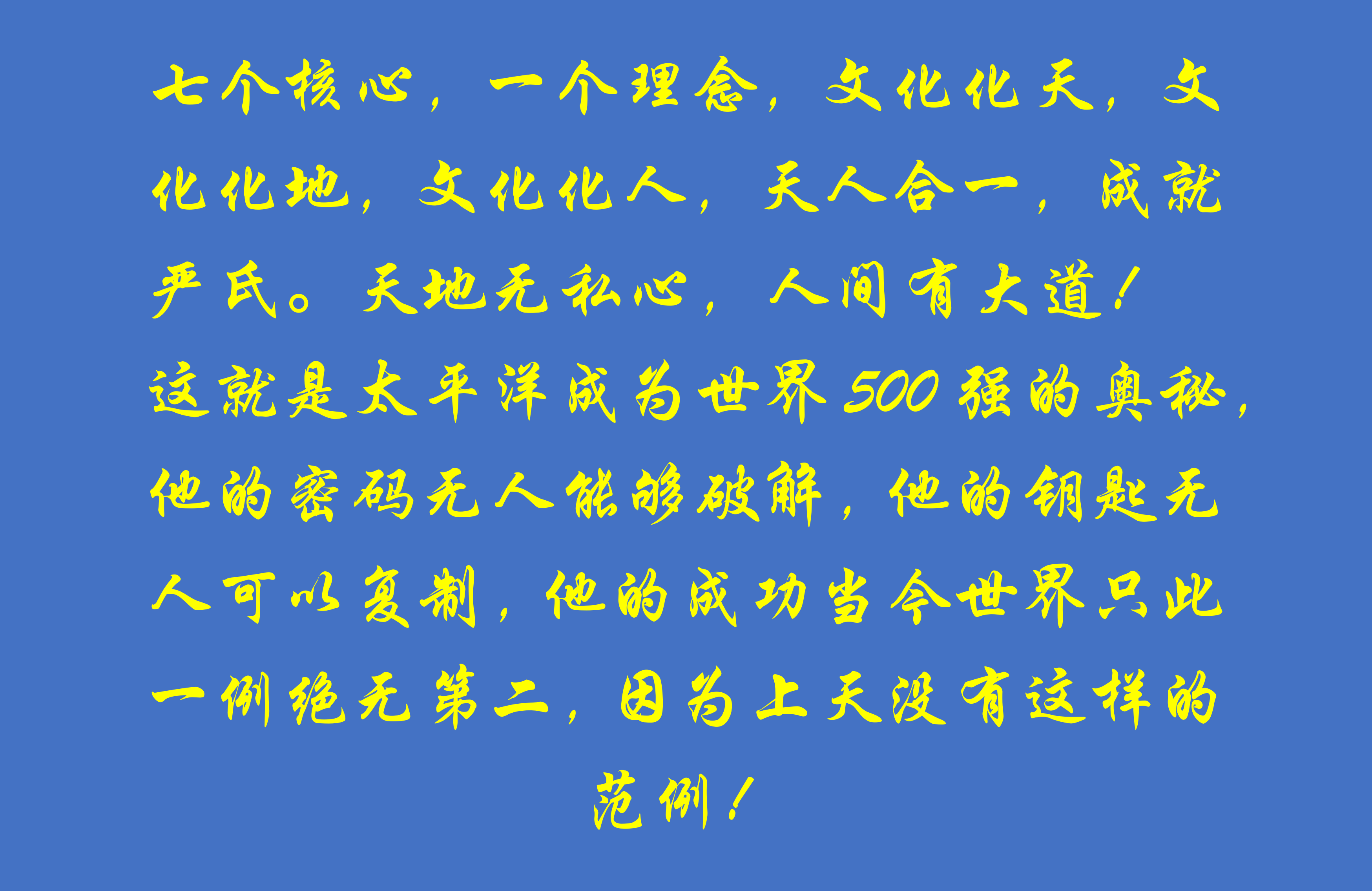这就是太平洋成为世界500强的奥秘,他的密码无人能够破解,他的钥匙无人可以复制,他的成功当今世界只此一例绝无第二,因为上天没有这样的范例!