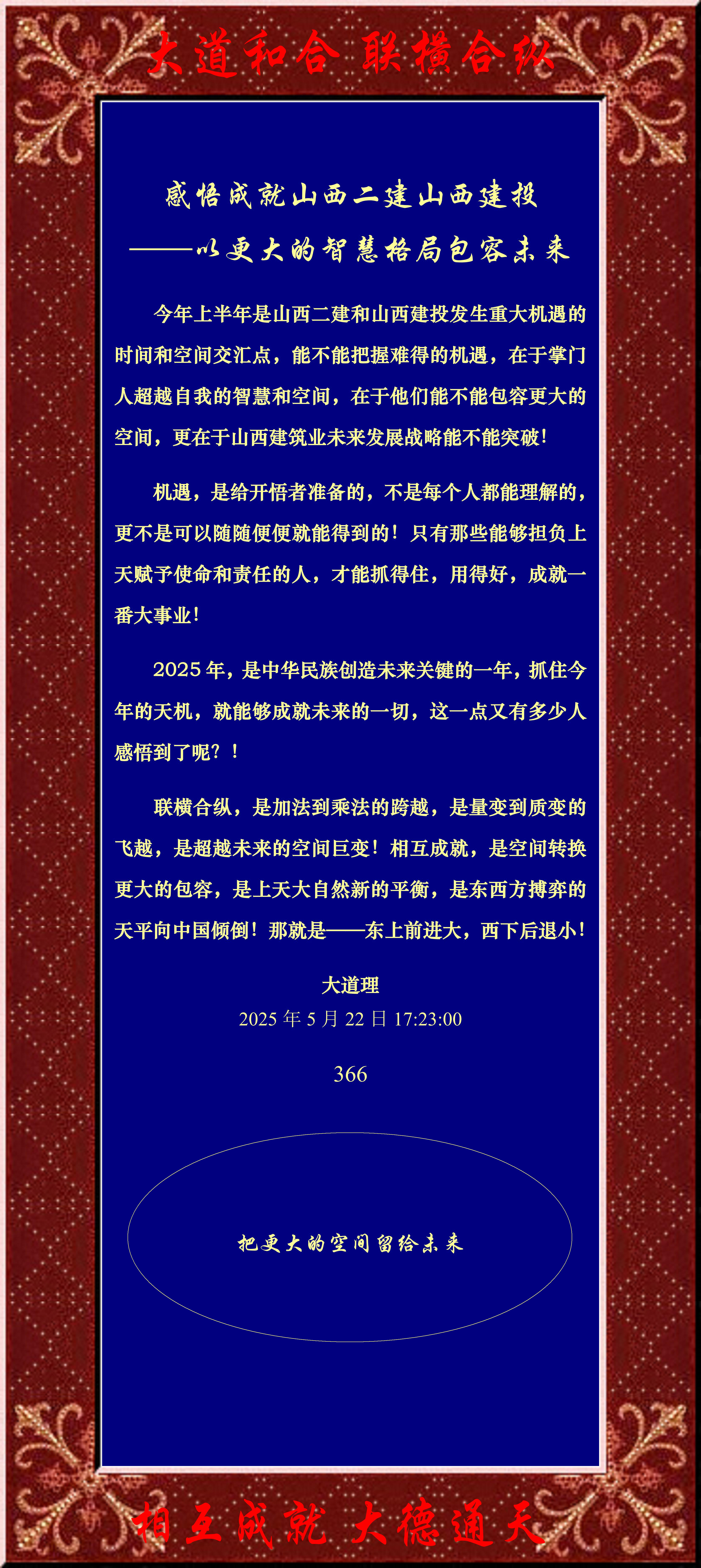 今年上半年是山西二建和山西建投发生重大机遇的时间和空间交汇点,能不能把握难得的机遇,在于掌门人超越自我的智慧和空间,在于他们能不能包容更大的空间,更在于山西建筑业未来发展战略能不能突破!