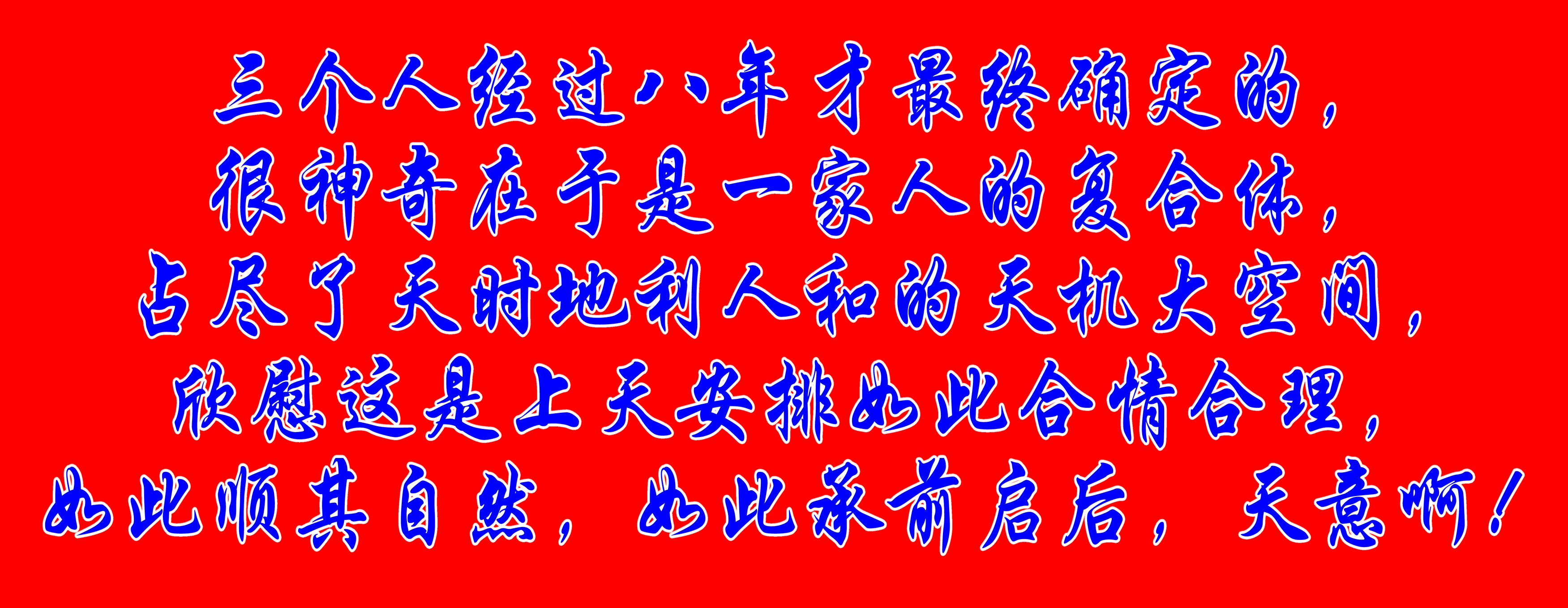 三个数字:11、13、15,这是我需要付出一辈子的智慧辅佐的三个人,二建掌门人,咱们的掌门人。15,第三人现在已经找到了,经过八年才最终确定的,很神奇在于是一家人的复合体,占尽了天时地利人和的天机大空间,欣慰这是上天安排如此合情合理,如此顺其自然,如此承前启后,天意啊!