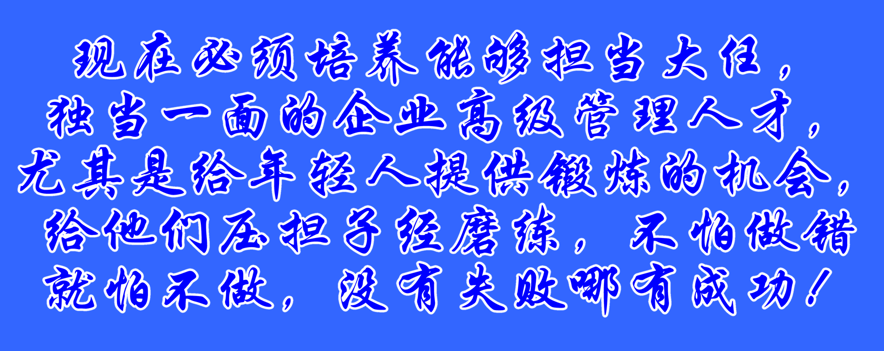 我对公司未来的重要人事,提出了建设性意见,现在必须培养能够担当大任,独当一面的企业高级管理人才,尤其是给年轻人提供锻炼的机会,给他们压担子经磨练,不怕做错就怕不做,没有失败哪有成功!