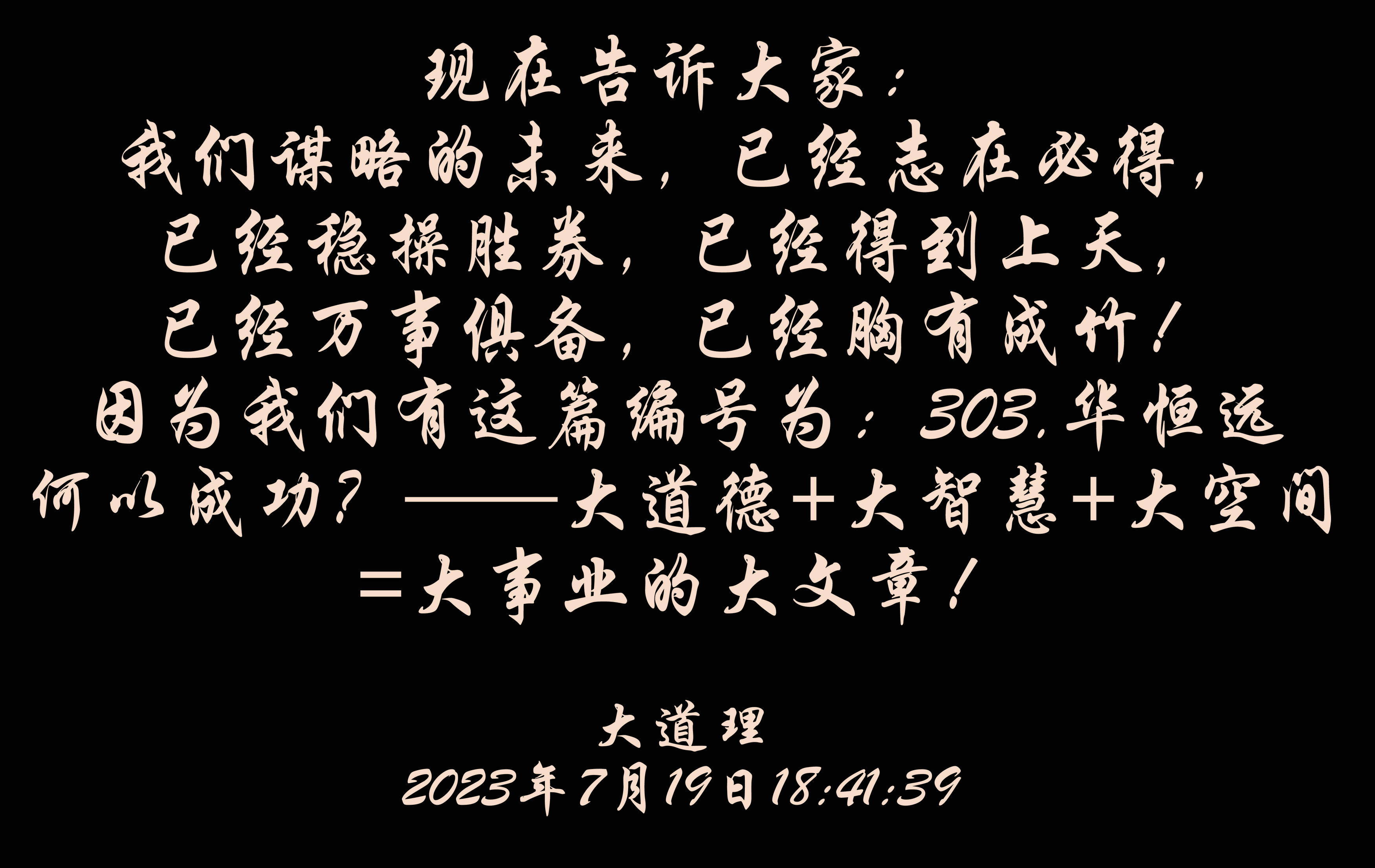 现在告诉大家:我们谋略的未来,已经志在必得,已经稳操胜券,已经得到上天,已经万事俱备,已经胸有成竹!因为我们有这篇编号为:303.k1体育何以成功?——大道德+大智慧+大空间=大事业的大文章!