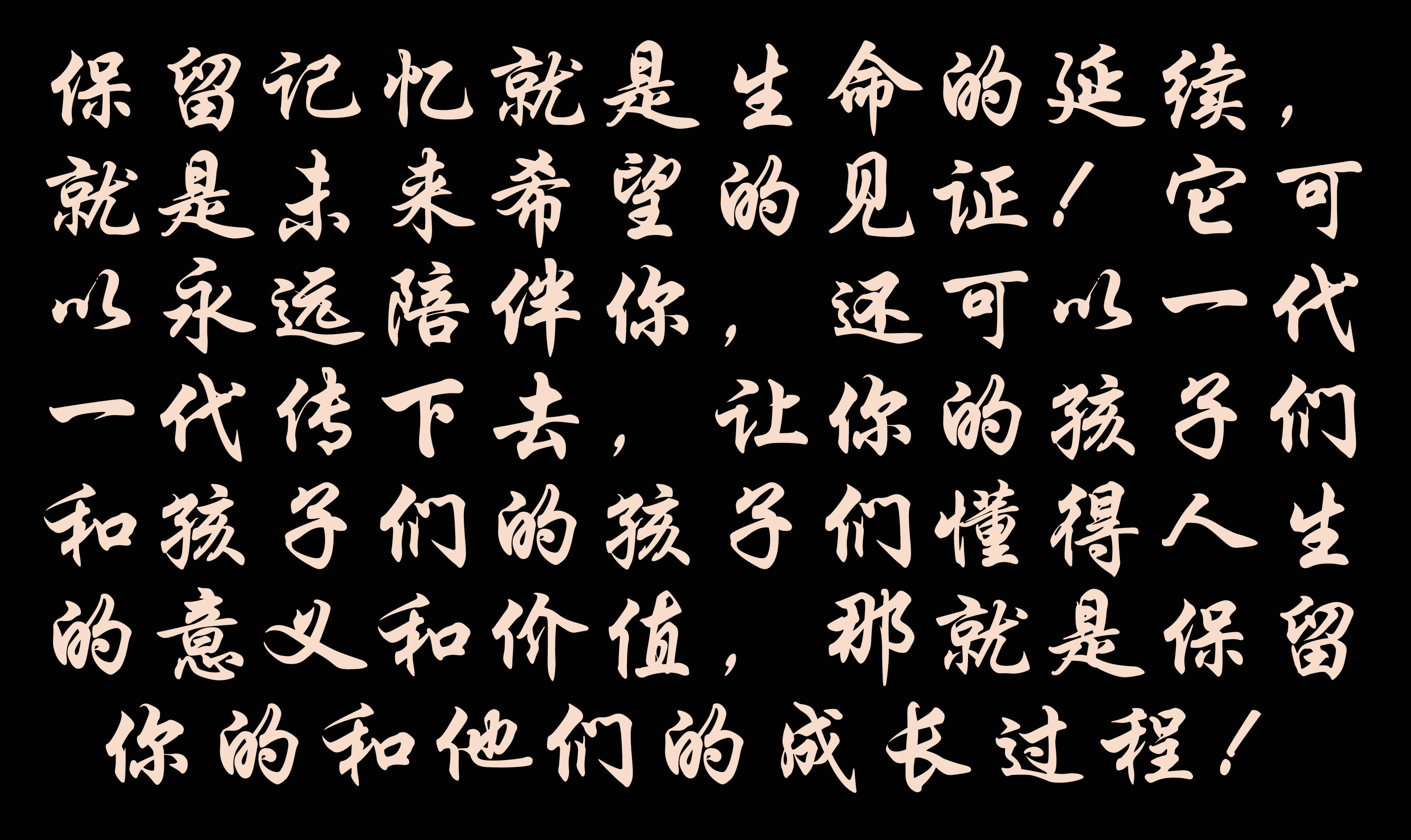 保留记忆就是生命的延续,就是未来希望的见证!它可以永远陪伴你,还可以一代一代传下去,让你的孩子们和孩子们的孩子们懂得人生的意义和价值,那就是保留你的和他们的成长过程!