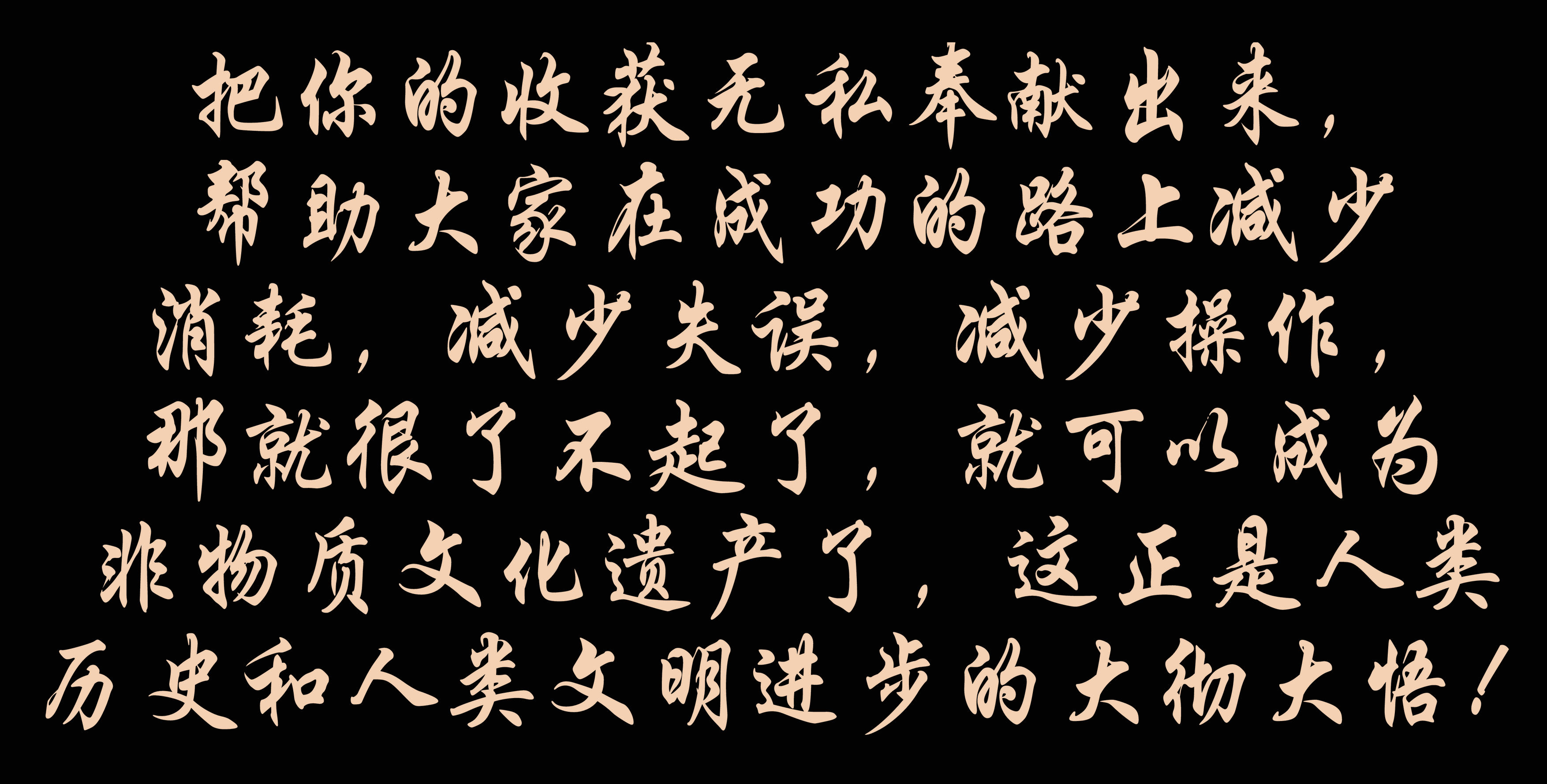 把你的收获无私奉献出来,帮助大家在成功的路上减少消耗,减少失误,减少操作,那就很了不起了,就可以成为非物质文化遗产了,这正是人类历史和人类文明进步的大彻大悟!