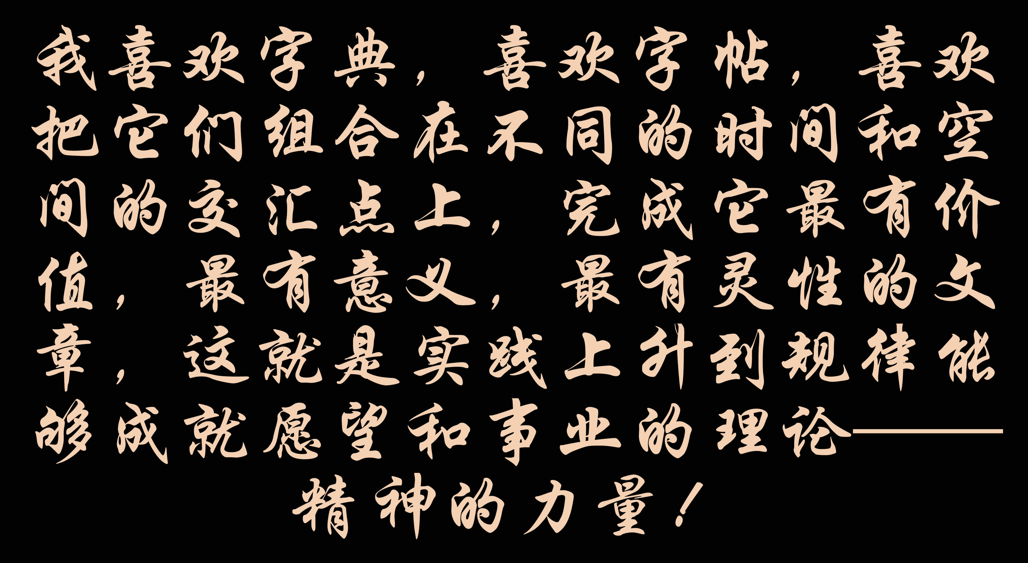所以,我喜欢字典,喜欢字帖,喜欢把它们组合在不同的时间和空间的交汇点上,完成它最有价值,最有意义,最有灵性的文章,这就是实践上升到规律能够成就愿望和事业的理论——精神的力量!