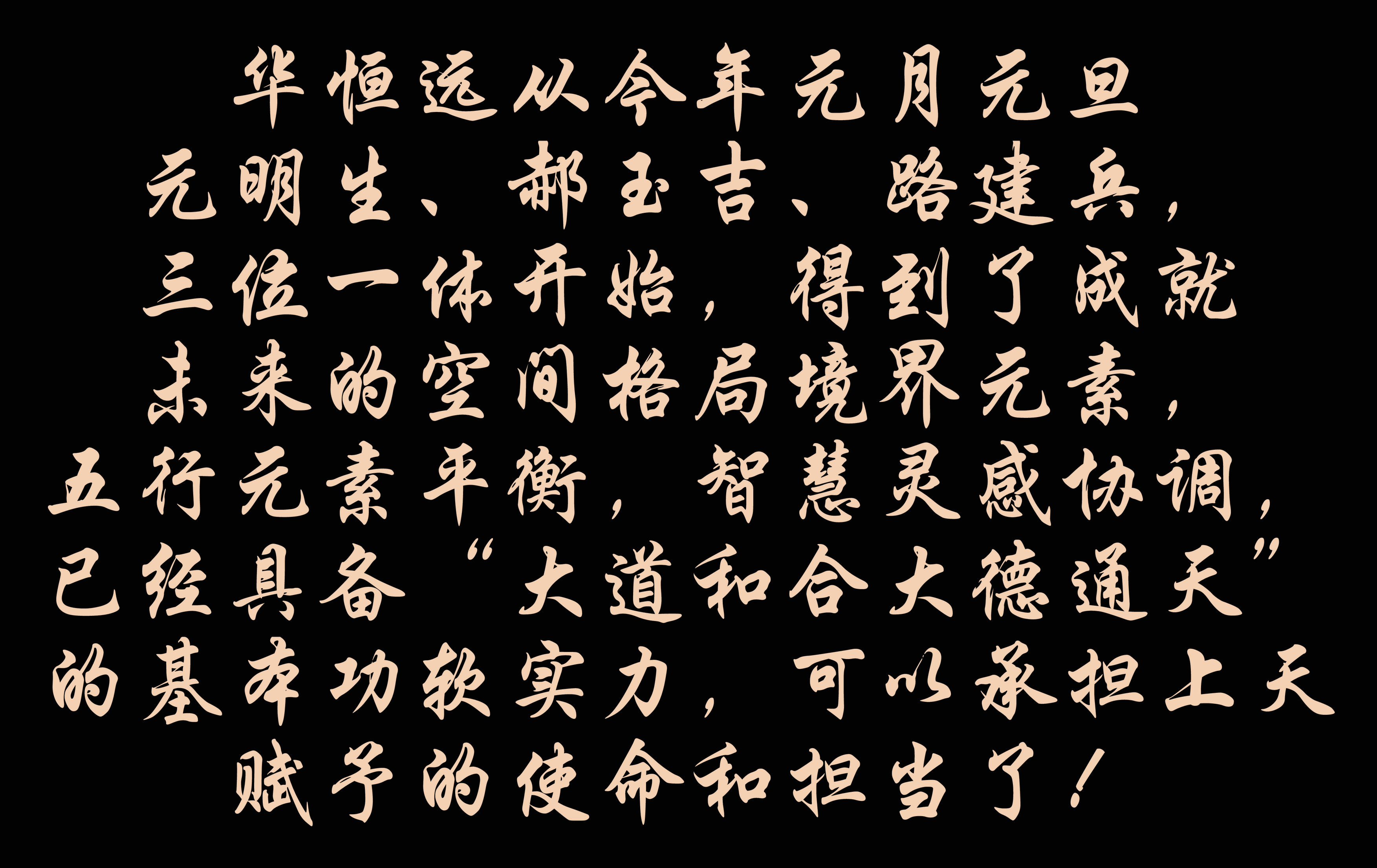 k1体育从今年元月元旦元明生、郝玉吉、路建兵,三位一体开始,得到了成就未来的空间格局境界元素,五行元素平衡,智慧灵感协调,已经具备“大道和合大德通天”的基本功软实力,可以承担上天赋予的使命和担当了!