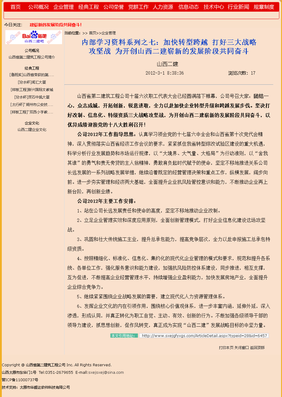 2、定位于立足企业,着眼行业,服务社会,以一流的信息服务,打造行业品牌网站,全面塑造“山西二建”行业品牌新形象的“山西二建”网站正式运行。