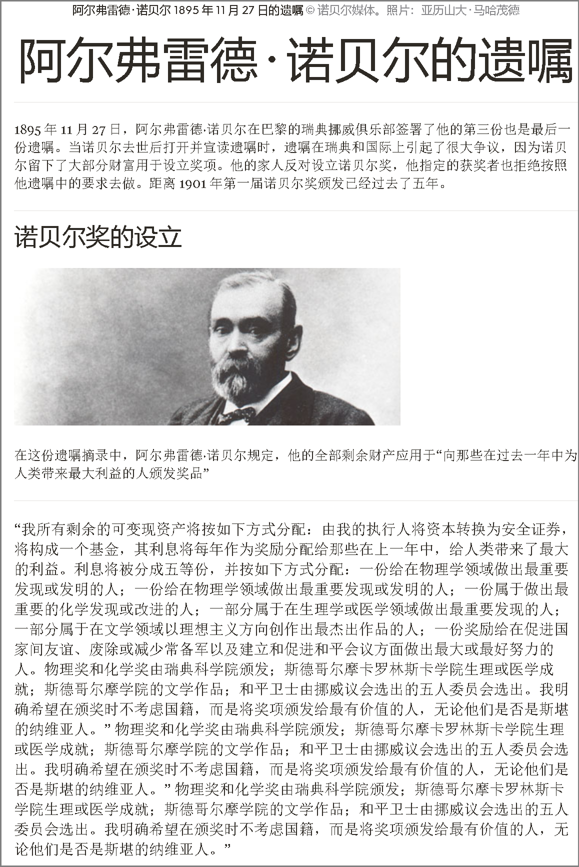 “我所有剩余的可变现资产将按如下方式分配:由我的执行人将资本转换为安全证券,将构成一个基金,其利息将每年作为奖励分配给那些在上一年中,给人类带来了最大的利益。利息将被分成五等份,并按如下方式分配:一份给在物理学领域做出最重要发现或发明的人;一份给在物理学领域做出最重要发现或发明的人;一份属于做出最重要的化学发现或改进的人;一部分属于在生理学或医学领域做出最重要发现的人;一部分属于在文学领域以理想主义方向创作出最杰出作品的人;一份奖励给在促进国家间友谊、废除或减少常备军以及建立和促进和平会议方面做出最大或最好努力的人。物理奖和化学奖由瑞典科学院颁发;斯德哥尔摩卡罗林斯卡学院生理或医学成就;斯德哥尔摩学院的文学作品;和平卫士由挪威议会选出的五人委员会选出。我明确希望在颁奖时不考虑国籍,而是将奖项颁发给最有价值的人,无论他们是否是斯堪的纳维亚人。” 物理奖和化学奖由瑞典科学院颁发;斯德哥尔摩卡罗林斯卡学院生理或医学成就;斯德哥尔摩学院的文学作品;和平卫士由挪威议会选出的五人委员会选出。我明确希望在颁奖时不考虑国籍,而是将奖项颁发给最有价值的人,无论他们是否是斯堪的纳维亚人。” 物理奖和化学奖由瑞典科学院颁发;斯德哥尔摩卡罗林斯卡学院生理或医学成就;斯德哥尔摩学院的文学作品;和平卫士由挪威议会选出的五人委员会选出。我明确希望在颁奖时不考虑国籍,而是将奖项颁发给最有价值的人,无论他们是否是斯堪的纳维亚人。”