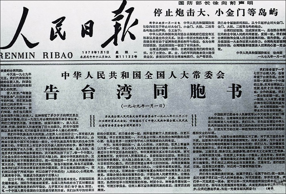 1979年元旦,中国同美国正式建立外交关系。同日,全国人大常委会发表《告台湾同胞书》,正式提出实现和平统一的大政方针;时任国防部长徐向前发表声明,宣布停止自1958年以来解放军对金门等岛屿的炮击。