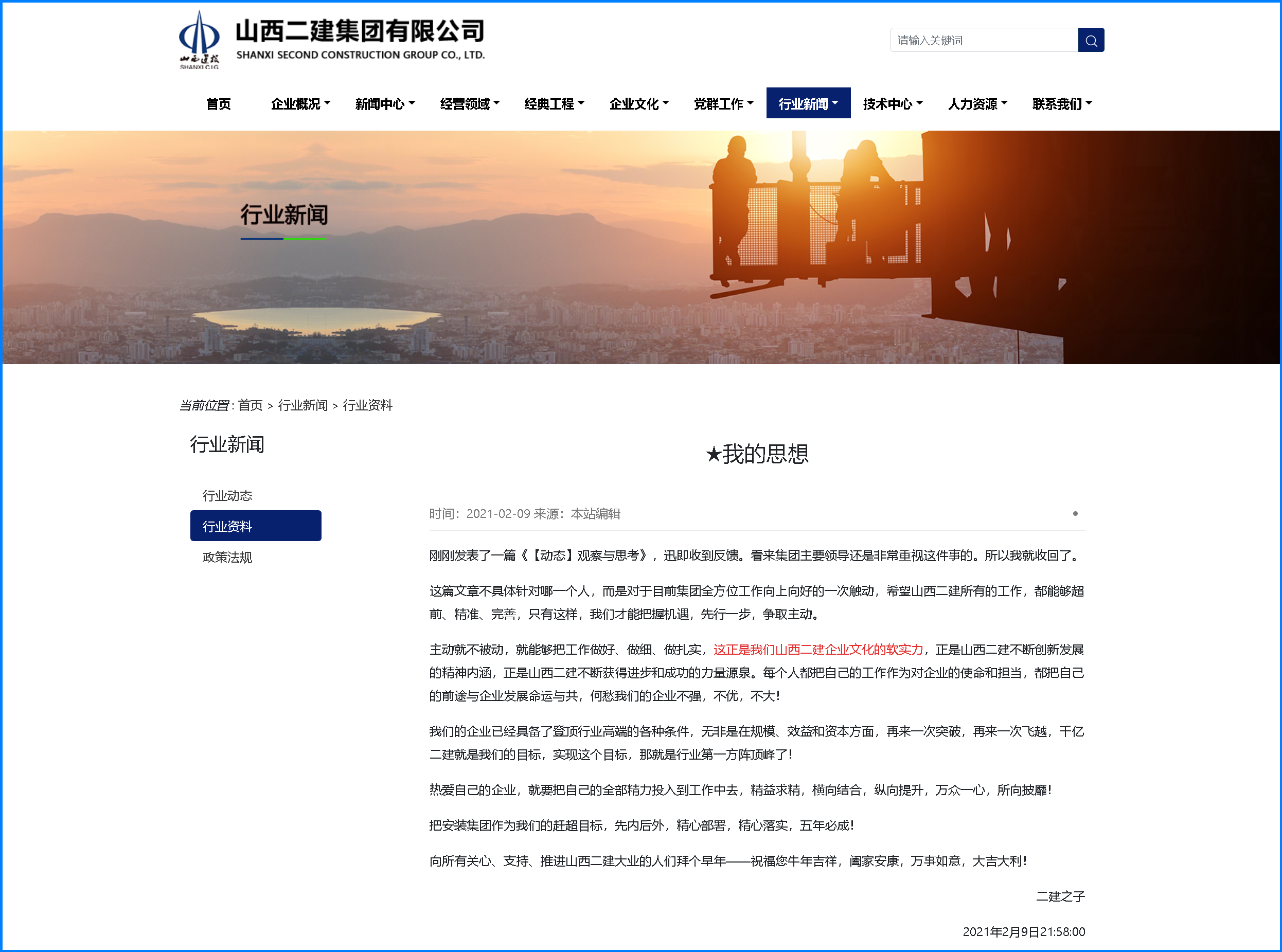 主动就不被动,就能够把工作做好、做细、做扎实,这正是我们山西二建企业文化的软实力,正是山西二建不断创新发展的精神内涵,正是山西二建不断获得进步和成功的力量源泉。每个人都把自己的工作作为对企业的使命和担当,都把自己的前途与企业发展命运与共,何愁我们的企业不强,不优,不大!