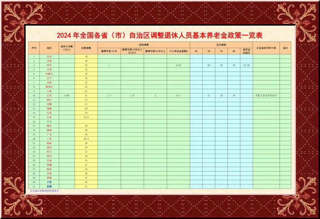 2024各地区退休人员养老金定额调整排序