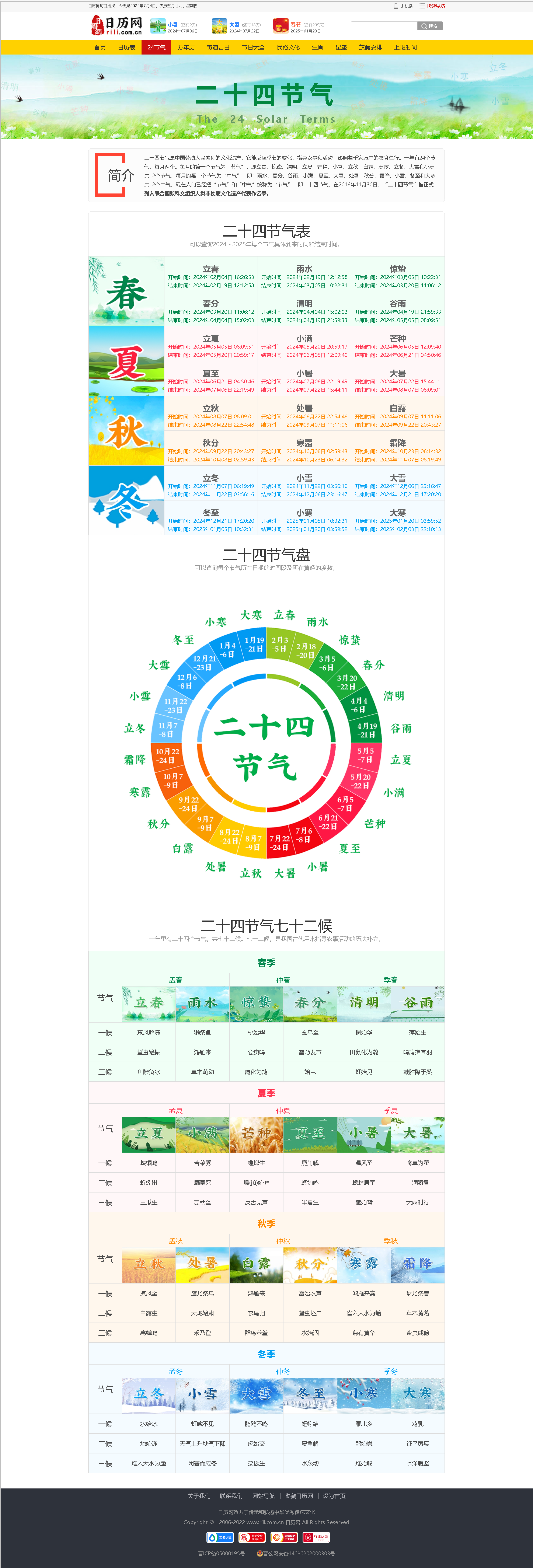 24 节气是我们华夏祖先历经千百年的实践创造出来的宝贵科学遗产,是反映天气气候和物候变化、掌握农事季节的工具。它起源于我国的黄河流域,远在春秋战国时代,中国就已经能用土圭(在平面上竖一根杆子)来测量正午太阳影子的长短,并且通过长短来确定冬至、夏至、春分、秋分四个节气。春秋时期的著作《尚书》中就对节气有所记述。以后不断地改进与完善,到秦汉年间,二十四节气已完全确立。西汉刘安著的《淮南子》一书里就有完整的二十四节气记载了。公元前104年,由邓平等制定的《太初历》,正式把二十四节气订于历法,明确了二十四节气的天文位置。